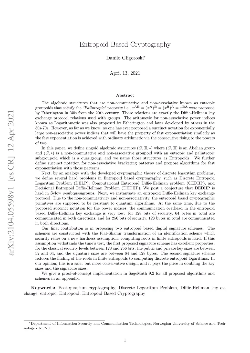 By analogy with the developed cryptographic theory of discrete logarithm problems, we define several hard problems in Entropoid based cryptography, such as Discrete Entropoid Logarithm Problem (DELP), Computational Entropoid Diffie-Hellman problem (CEDHP), and Decisional Entropoid Diffie-Hellman Problem (DEDHP). We post a conjecture that DEDHP is hard in Sylow -subquasigroups. Next, we instantiate an entropoid Diffie-Hellman key exchange protocol. Due to the non-commutativity and non-associativity, the entropoid based cryptographic primitives are supposed to be resistant to quantum algorithms. At the same time, due to the proposed succinct notation for the power indices, the communication overhead in the entropoid based Diffie-Hellman key exchange is very low: for 128 bits of security, 64 bytes in total are communicated in both directions, and for 256 bits of security, 128 bytes in total are communicated in both directions. Our final contribution is in proposing two entropoid based digital signature schemes. The schemes are constructed with the Fiat-Shamir transformation of an identification scheme which security relies on a new hardness assumption: computing roots in finite entropoids is hard. If this assumption withstands the time's test, the first proposed signature scheme has excellent properties: for the classical security levels between 128 and 256 bits, the public and private key sizes are between 32 and 64, and the signature sizes are between 64 and 128 bytes. The second signature scheme reduces the finding of the roots in finite entropoids to computing discrete entropoid logarithms. In our opinion, this is a safer but more conservative design, and it pays the price in doubling the key sizes and the signature sizes. We give a proof-of-concept implementation in SageMath 9.2 for all proposed algorithms and schemes in an appendix.