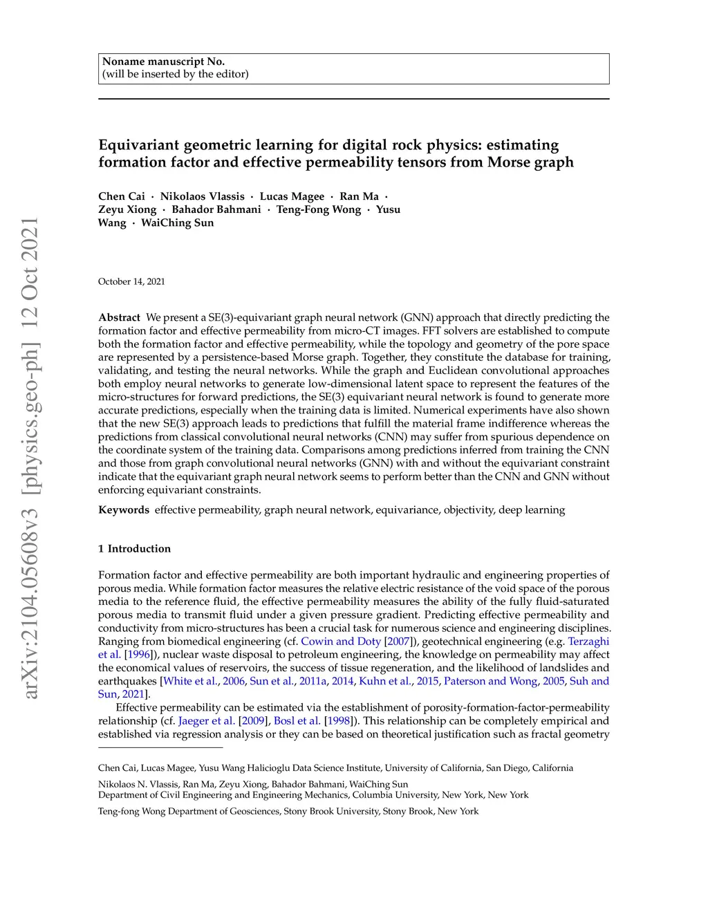 We present a SE(3)-equivariant graph neural network (GNN) approach that directly predicting the formation factor and effective permeability from micro-CT images. FFT solvers are established to compute both the formation factor and effective permeability, while the topology and geometry of the pore space are represented by a persistence-based Morse graph. Together, they constitute the database for training, validating, and testing the neural networks. While the graph and Euclidean convolutional approaches both employ neural networks to generate low-dimensional latent space to represent the features of the micro-structures for forward predictions, the SE(3) equivariant neural network is found to generate more accurate predictions, especially when the training data is limited. Numerical experiments have also shown that the new SE(3) approach leads to predictions that fulfill the material frame indifference whereas the predictions from classical convolutional neural networks (CNN) may suffer from spurious dependence on the coordinate system of the training data. Comparisons among predictions inferred from training the CNN and those from graph convolutional neural networks (GNN) with and without the equivariant constraint indicate that the equivariant graph neural network seems to perform better than the CNN and GNN without enforcing equivariant constraints.