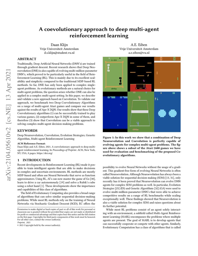 Traditionally, Deep Artificial Neural Networks (DNN's) are trained through gradient descent. Recent research shows that Deep Neuroevolution (DNE) is also capable of evolving multi-million-parameter DNN's, which proved to be particularly useful in the field of Reinforcement Learning (RL). This is mainly due to its excellent scalability and simplicity compared to the traditional MDP-based RL methods. So far, DNE has only been applied to complex single-agent problems. As evolutionary methods are a natural choice for multi-agent problems, the question arises whether DNE can also be applied in a complex multi-agent setting. In this paper, we describe and validate a new approach based on Coevolution. To validate our approach, we benchmark two Deep Coevolutionary Algorithms on a range of multi-agent Atari games and compare our results against the results of Ape-X DQN. Our results show that these Deep Coevolutionary algorithms (1) can be successfully trained to play various games, (2) outperform Ape-X DQN in some of them, and therefore (3) show that Coevolution can be a viable approach to solving complex multi-agent decision-making problems.