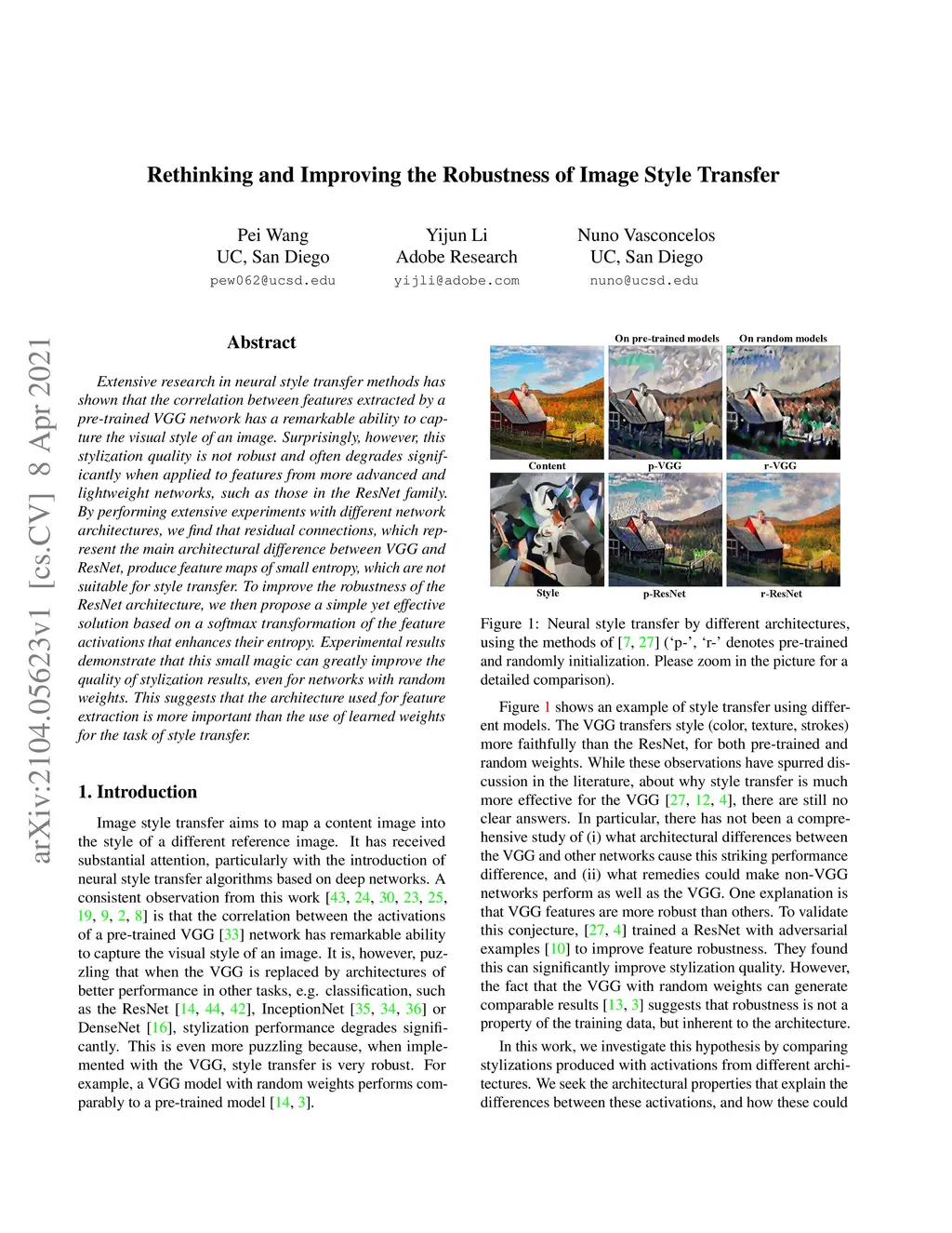Extensive research in neural style transfer methods has shown that the correlation between features extracted by a pre-trained VGG network has a remarkable ability to capture the visual style of an image. Surprisingly, however, this stylization quality is not robust and often degrades significantly when applied to features from more advanced and lightweight networks, such as those in the ResNet family. By performing extensive experiments with different network architectures, we find that residual connections, which represent the main architectural difference between VGG and ResNet, produce feature maps of small entropy, which are not suitable for style transfer. To improve the robustness of the ResNet architecture, we then propose a simple yet effective solution based on a softmax transformation of the feature activations that enhances their entropy. Experimental results demonstrate that this small magic can greatly improve the quality of stylization results, even for networks with random weights. This suggests that the architecture used for feature extraction is more important than the use of learned weights for the task of style transfer.