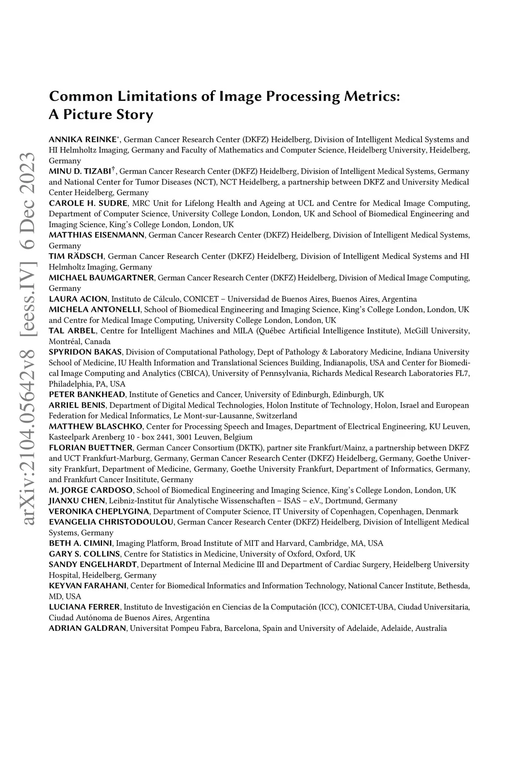 While the importance of automatic image analysis is continuously increasing, recent meta-research revealed major flaws with respect to algorithm validation. Performance metrics are particularly key for meaningful, objective, and transparent performance assessment and validation of the used automatic algorithms, but relatively little attention has been given to the practical pitfalls when using specific metrics for a given image analysis task. These are typically related to (1) the disregard of inherent metric properties, such as the behaviour in the presence of class imbalance or small target structures, (2) the disregard of inherent data set properties, such as the non-independence of the test cases, and (3) the disregard of the actual biomedical domain interest that the metrics should reflect. This living dynamically document has the purpose to illustrate important limitations of performance metrics commonly applied in the field of image analysis. In this context, it focuses on biomedical image analysis problems that can be phrased as image-level classification, semantic segmentation, instance segmentation, or object detection task. The current version is based on a Delphi process on metrics conducted by an international consortium of image analysis experts from more than 60 institutions worldwide.