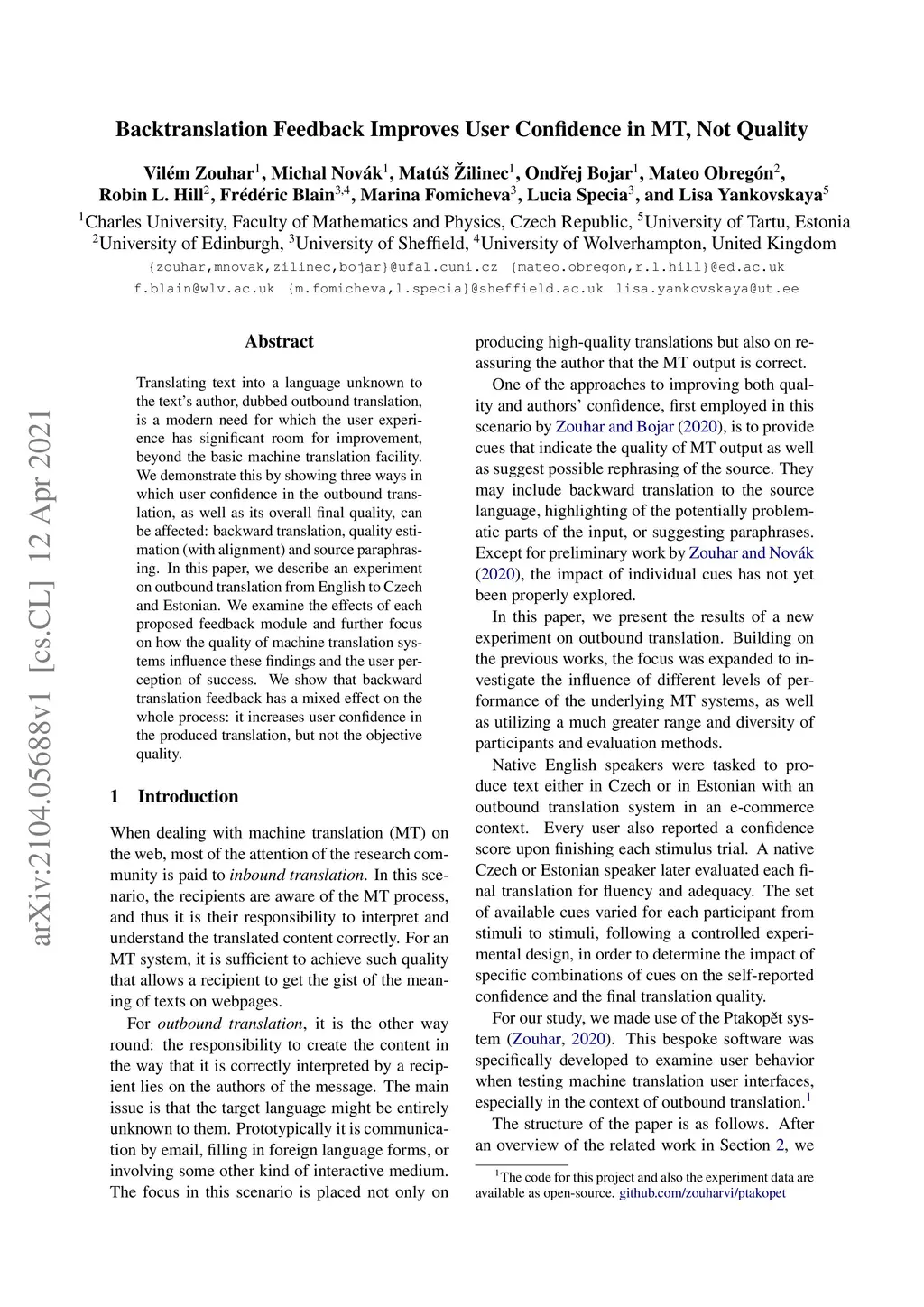 Translating text into a language unknown to the text's author, dubbed outbound translation, is a modern need for which the user experience has significant room for improvement, beyond the basic machine translation facility. We demonstrate this by showing three ways in which user confidence in the outbound translation, as well as its overall final quality, can be affected: backward translation, quality estimation (with alignment) and source paraphrasing. In this paper, we describe an experiment on outbound translation from English to Czech and Estonian. We examine the effects of each proposed feedback module and further focus on how the quality of machine translation systems influence these findings and the user perception of success. We show that backward translation feedback has a mixed effect on the whole process: it increases user confidence in the produced translation, but not the objective quality.
