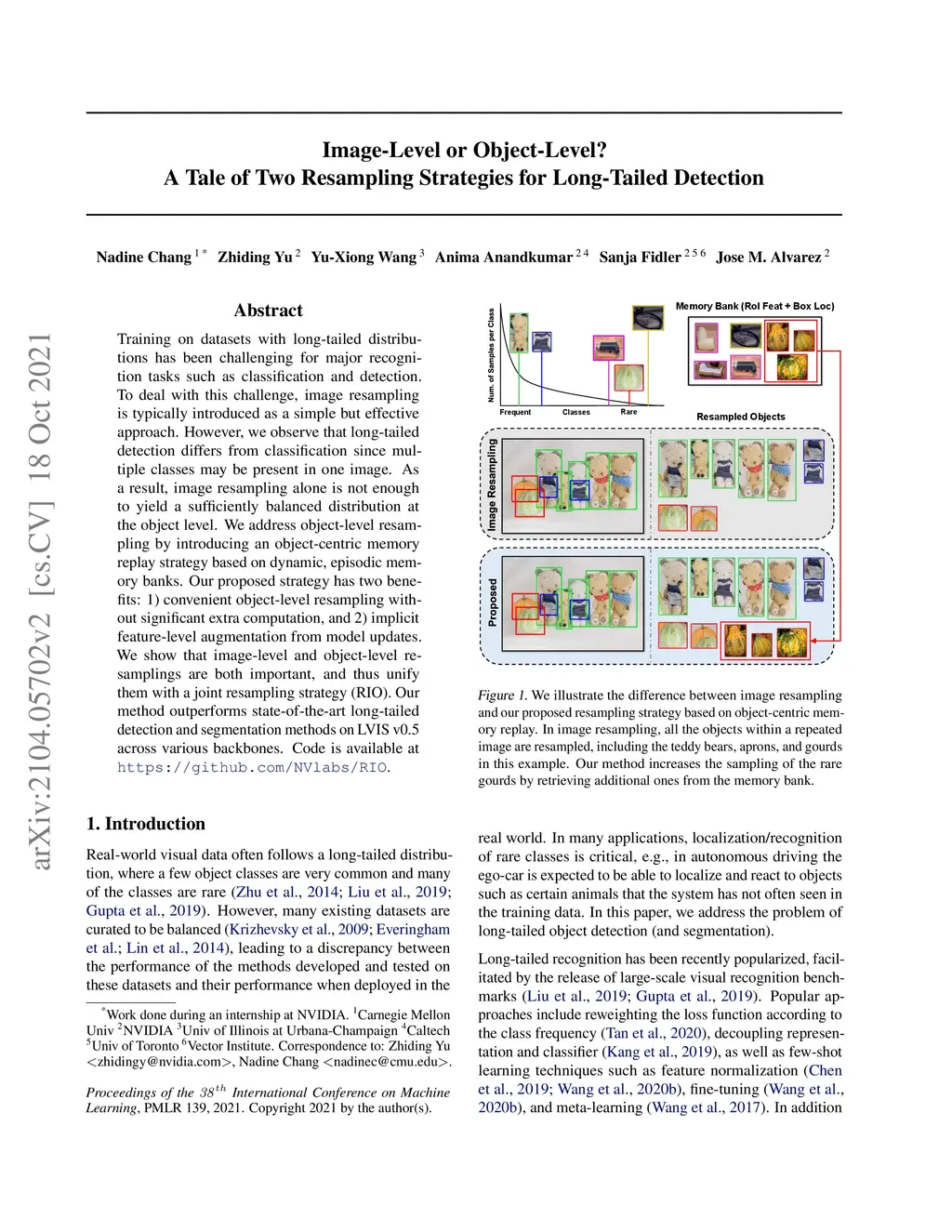 Training on datasets with long-tailed distributions has been challenging for major recognition tasks such as classification and detection. To deal with this challenge, image resampling is typically introduced as a simple but effective approach. However, we observe that long-tailed detection differs from classification since multiple classes may be present in one image. As a result, image resampling alone is not enough to yield a sufficiently balanced distribution at the object level. We address object-level resampling by introducing an object-centric memory replay strategy based on dynamic, episodic memory banks. Our proposed strategy has two benefits: 1) convenient object-level resampling without significant extra computation, and 2) implicit feature-level augmentation from model updates. We show that image-level and object-level resamplings are both important, and thus unify them with a joint resampling strategy (RIO). Our method outperforms state-of-the-art long-tailed detection and segmentation methods on LVIS v0.5 across various backbones. Code is available at https://github.com/NVlabs/RIO.