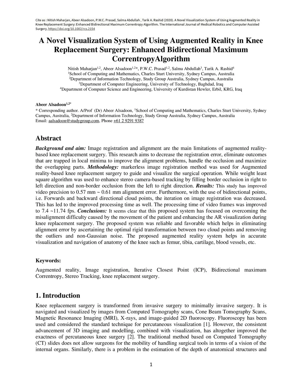 Background and aim: Image registration and alignment are the main limitations of augmented reality-based knee replacement surgery. This research aims to decrease the registration error, eliminate outcomes that are trapped in local minima to improve the alignment problems, handle the occlusion, and maximize the overlapping parts. Methodology: markerless image registration method was used for Augmented reality-based knee replacement surgery to guide and visualize the surgical operation. While weight least square algorithm was used to enhance stereo camera-based tracking by filling border occlusion in right to left direction and non-border occlusion from left to right direction. Results: This study has improved video precision to 0.57 mm~0.61 mm alignment error. Furthermore, with the use of bidirectional points, for example, forwards and backwards directional cloud point, the iteration on image registration was decreased. This has led to improve the processing time as well. The processing time of video frames was improved to 7.4~11.74 fps. Conclusions: It seems clear that this proposed system has focused on overcoming the misalignment difficulty caused by movement of patient and enhancing the AR visualization during knee replacement surgery. The proposed system was reliable and favorable which helps in eliminating alignment error by ascertaining the optimal rigid transformation between two cloud points and removing the outliers and non-Gaussian noise. The proposed augmented reality system helps in accurate visualization and navigation of anatomy of knee such as femur, tibia, cartilage, blood vessels, etc.