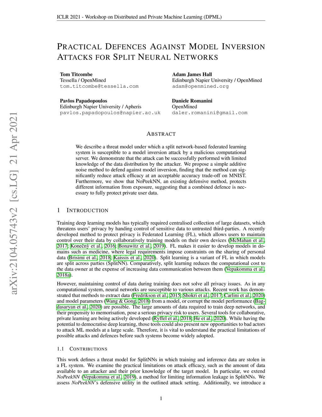 We describe a threat model under which a split network-based federated learning system is susceptible to a model inversion attack by a malicious computational server. We demonstrate that the attack can be successfully performed with limited knowledge of the data distribution by the attacker. We propose a simple additive noise method to defend against model inversion, finding that the method can significantly reduce attack efficacy at an acceptable accuracy trade-off on MNIST. Furthermore, we show that NoPeekNN, an existing defensive method, protects different information from exposure, suggesting that a combined defence is necessary to fully protect private user data.