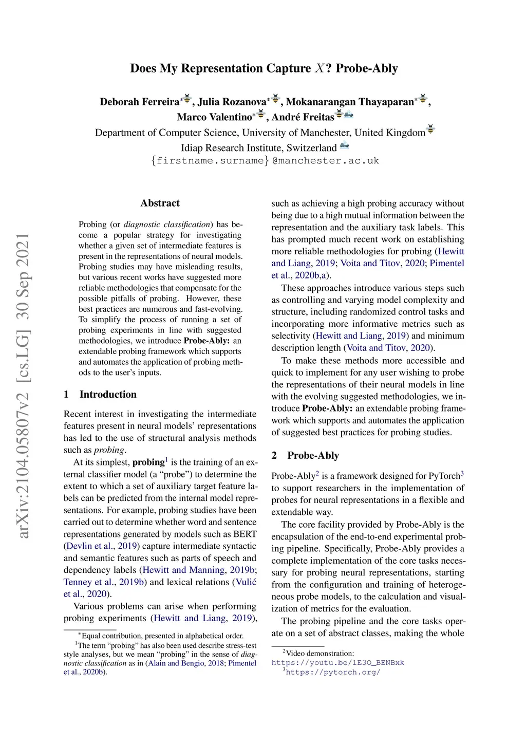 Probing (or diagnostic classification) has become a popular strategy for investigating whether a given set of intermediate features is present in the representations of neural models. Probing studies may have misleading results, but various recent works have suggested more reliable methodologies that compensate for the possible pitfalls of probing. However, these best practices are numerous and fast-evolving. To simplify the process of running a set of probing experiments in line with suggested methodologies, we introduce Probe-Ably: an extendable probing framework which supports and automates the application of probing methods to the user's inputs.