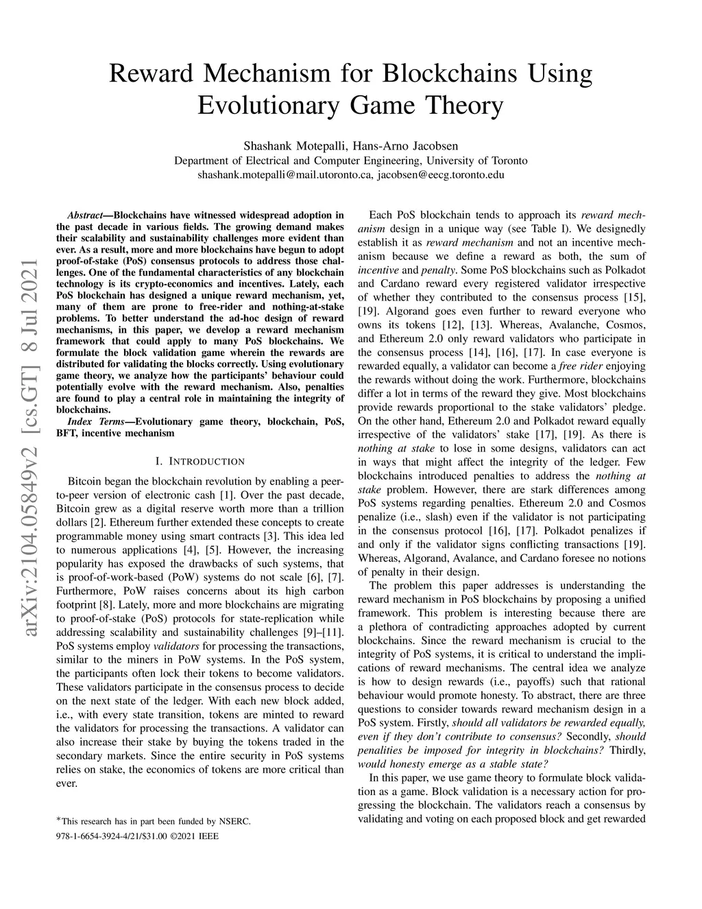 Reward Mechanism for Blockchains Using Evolutionary Game Theory