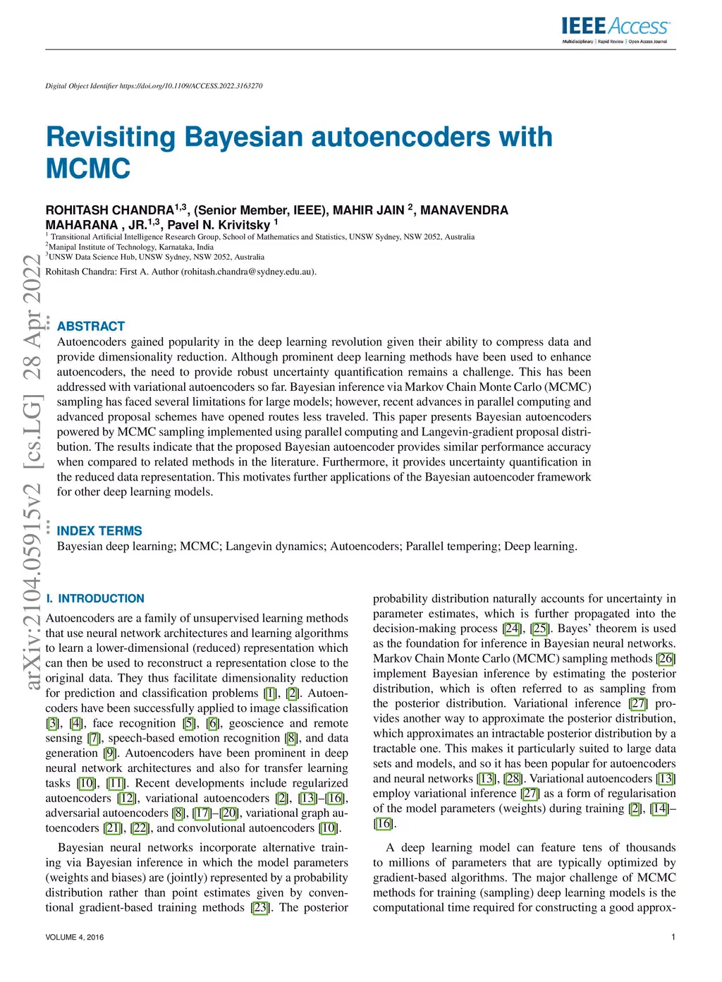 Autoencoders gained popularity in the deep learning revolution given their ability to compress data and provide dimensionality reduction. Although prominent deep learning methods have been used to enhance autoencoders, the need to provide robust uncertainty quantification remains a challenge. This has been addressed with variational autoencoders so far. Bayesian inference via Markov Chain Monte Carlo (MCMC) sampling has faced several limitations for large models; however, recent advances in parallel computing and advanced proposal schemes have opened routes less traveled. This paper presents Bayesian autoencoders powered by MCMC sampling implemented using parallel computing and Langevin-gradient proposal distribution. The results indicate that the proposed Bayesian autoencoder provides similar performance accuracy when compared to related methods in the literature. Furthermore, it provides uncertainty quantification in the reduced data representation. This motivates further applications of the Bayesian autoencoder framework for other deep learning models.