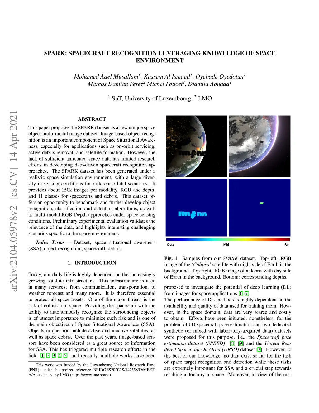 This paper proposes the SPARK dataset as a new unique space object multi-modal image dataset. Image-based object recognition is an important component of Space Situational Awareness, especially for applications such as on-orbit servicing, active debris removal, and satellite formation. However, the lack of sufficient annotated space data has limited research efforts in developing data-driven spacecraft recognition approaches. The SPARK dataset has been generated under a realistic space simulation environment, with a large diversity in sensing conditions for different orbital scenarios. It provides about 150k images per modality, RGB and depth, and 11 classes for spacecrafts and debris. This dataset offers an opportunity to benchmark and further develop object recognition, classification and detection algorithms, as well as multi-modal RGB-Depth approaches under space sensing conditions. Preliminary experimental evaluation validates the relevance of the data, and highlights interesting challenging scenarios specific to the space environment.