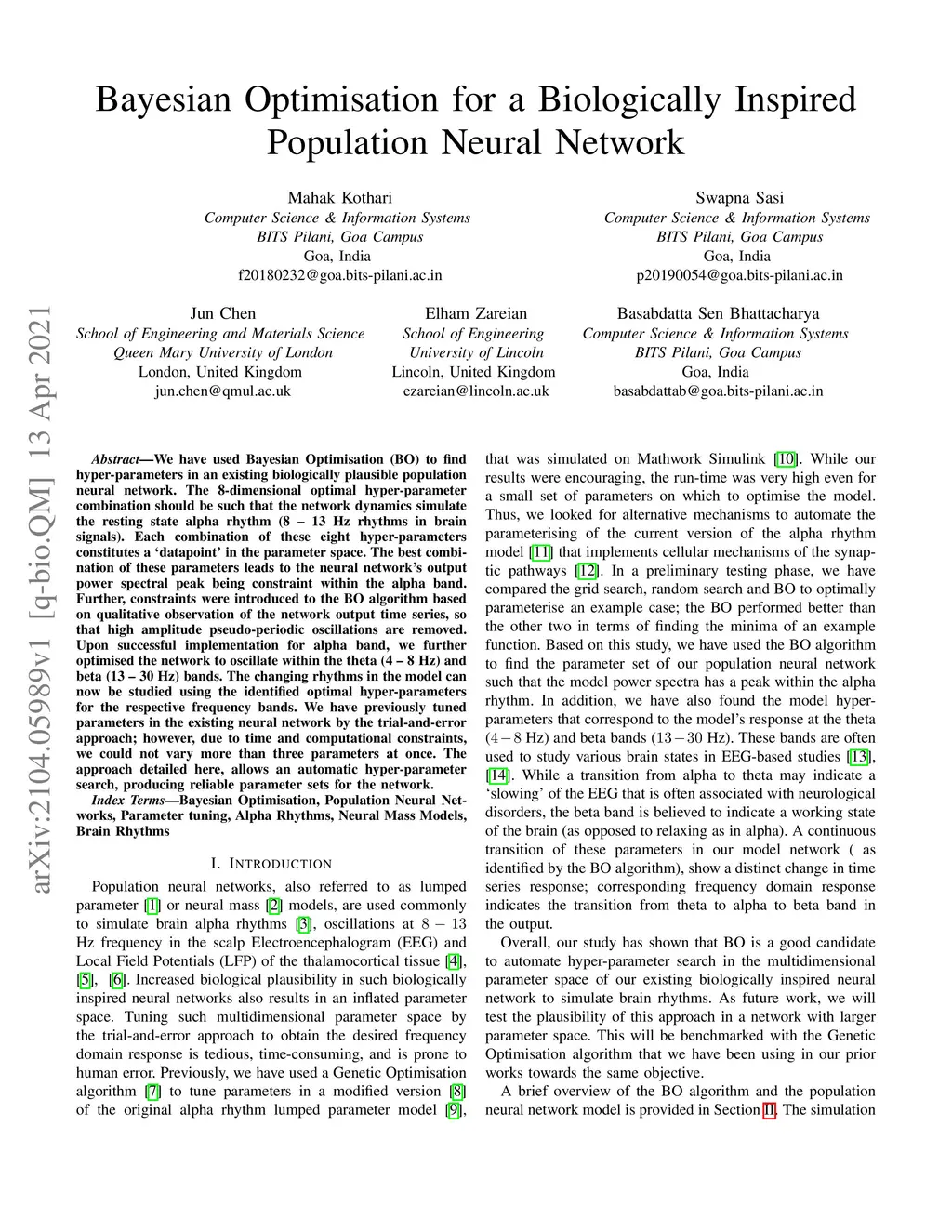 We have used Bayesian Optimisation (BO) to find hyper-parameters in an existing biologically plausible population neural network. The 8-dimensional optimal hyper-parameter combination should be such that the network dynamics simulate the resting state alpha rhythm (8 - 13 Hz rhythms in brain signals). Each combination of these eight hyper-parameters constitutes a 'datapoint' in the parameter space. The best combination of these parameters leads to the neural network's output power spectral peak being constraint within the alpha band. Further, constraints were introduced to the BO algorithm based on qualitative observation of the network output time series, so that high amplitude pseudo-periodic oscillations are removed. Upon successful implementation for alpha band, we further optimised the network to oscillate within the theta (4 - 8 Hz) and beta (13 - 30 Hz) bands. The changing rhythms in the model can now be studied using the identified optimal hyper-parameters for the respective frequency bands. We have previously tuned parameters in the existing neural network by the trial-and-error approach; however, due to time and computational constraints, we could not vary more than three parameters at once. The approach detailed here, allows an automatic hyper-parameter search, producing reliable parameter sets for the network.