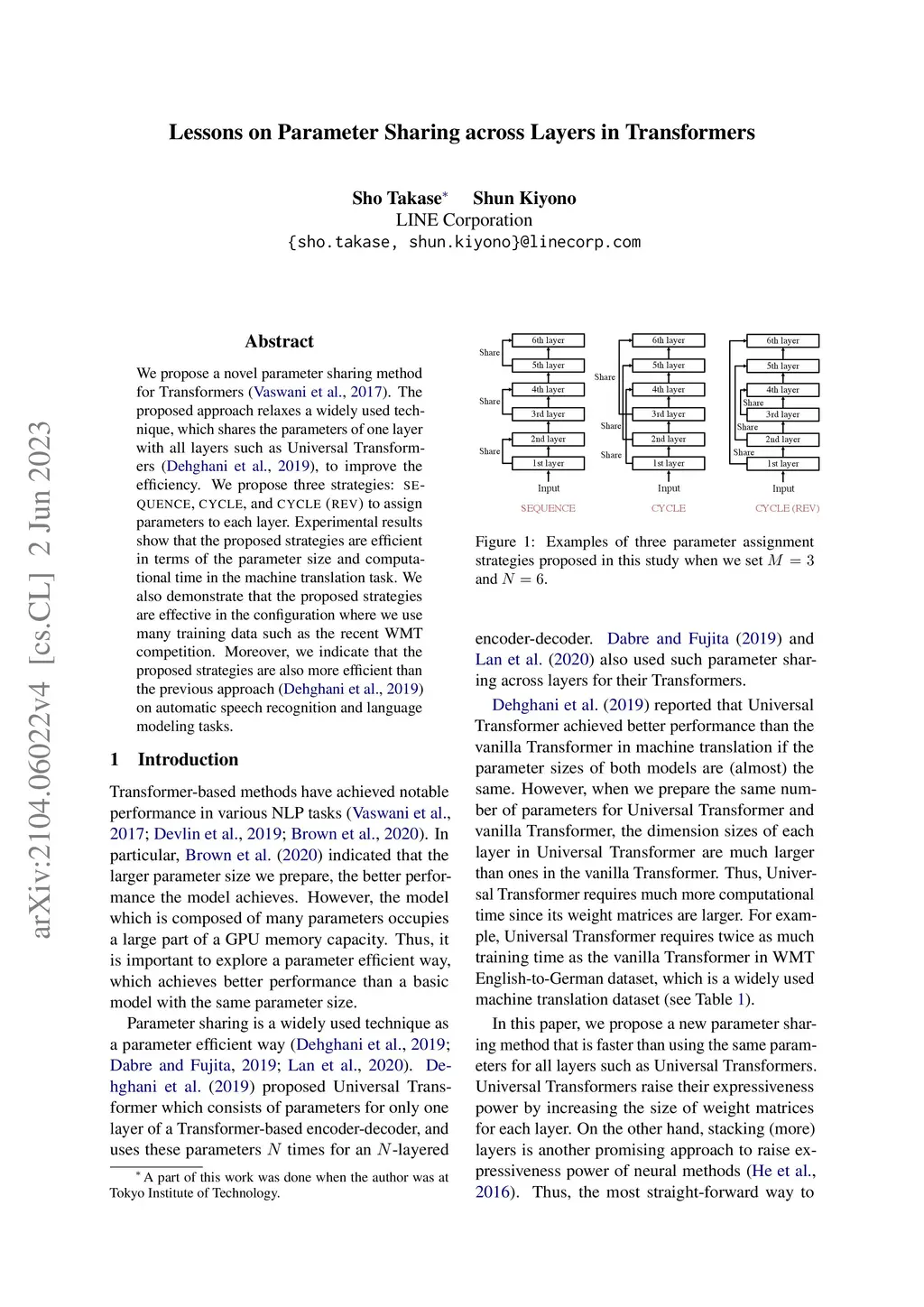 We propose a parameter sharing method for Transformers (Vaswani et al., 2017). The proposed approach relaxes a widely used technique, which shares parameters for one layer with all layers such as Universal Transformers (Dehghani et al., 2019), to increase the efficiency in the computational time. We propose three strategies: Sequence, Cycle, and Cycle (rev) to assign parameters to each layer. Experimental results show that the proposed strategies are efficient in the parameter size and computational time. Moreover, we indicate that the proposed strategies are also effective in the configuration where we use many training data such as the recent WMT competition.