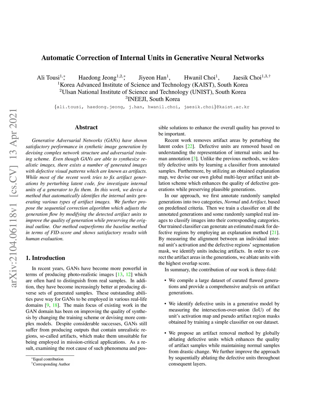 Generative Adversarial Networks (GANs) have shown satisfactory performance in synthetic image generation by devising complex network structure and adversarial training scheme. Even though GANs are able to synthesize realistic images, there exists a number of generated images with defective visual patterns which are known as artifacts. While most of the recent work tries to fix artifact generations by perturbing latent code, few investigate internal units of a generator to fix them. In this work, we devise a method that automatically identifies the internal units generating various types of artifact images. We further propose the sequential correction algorithm which adjusts the generation flow by modifying the detected artifact units to improve the quality of generation while preserving the original outline. Our method outperforms the baseline method in terms of FID-score and shows satisfactory results with human evaluation.