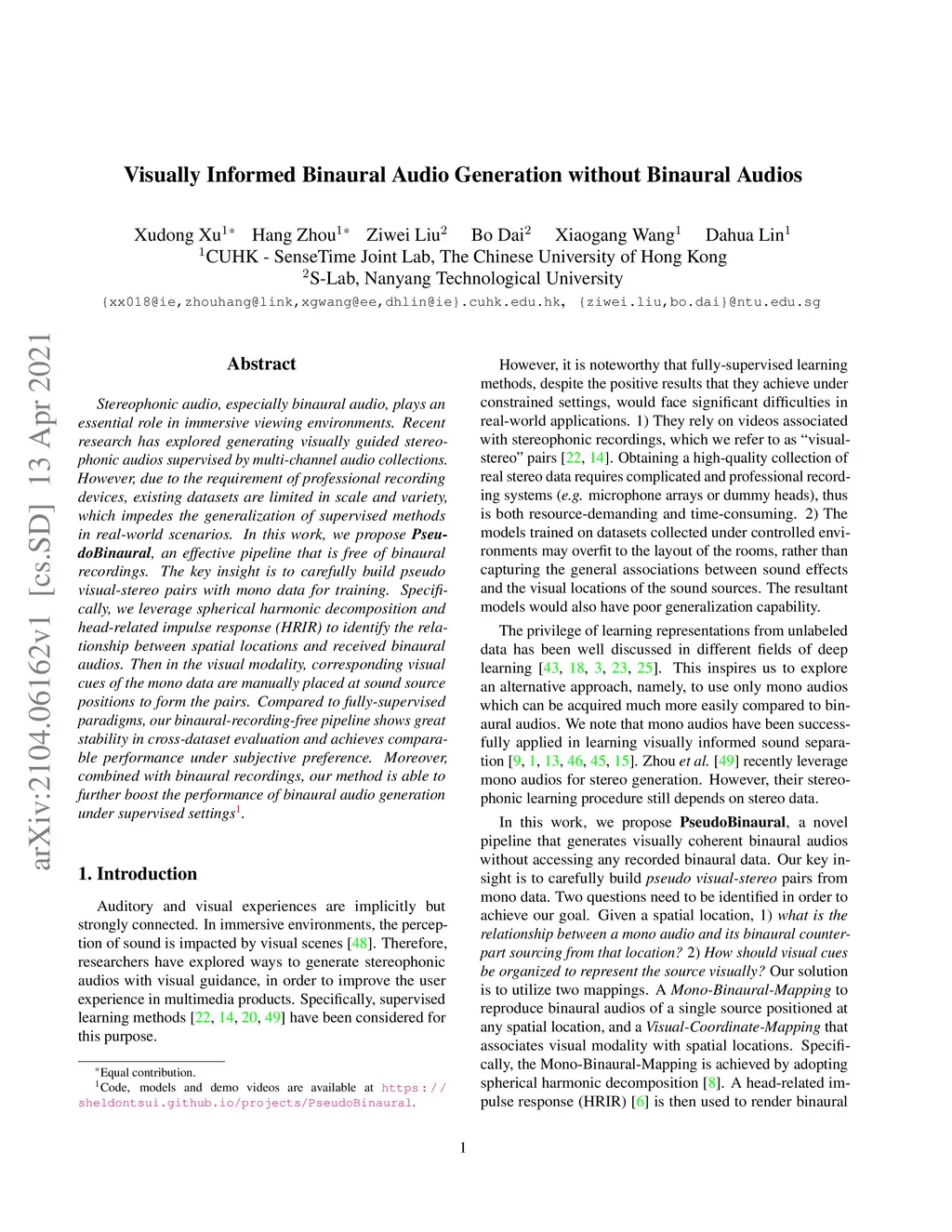 Stereophonic audio, especially binaural audio, plays an essential role in immersive viewing environments. Recent research has explored generating visually guided stereophonic audios supervised by multi-channel audio collections. However, due to the requirement of professional recording devices, existing datasets are limited in scale and variety, which impedes the generalization of supervised methods in real-world scenarios. In this work, we propose PseudoBinaural, an effective pipeline that is free of binaural recordings. The key insight is to carefully build pseudo visual-stereo pairs with mono data for training. Specifically, we leverage spherical harmonic decomposition and head-related impulse response (HRIR) to identify the relationship between spatial locations and received binaural audios. Then in the visual modality, corresponding visual cues of the mono data are manually placed at sound source positions to form the pairs. Compared to fully-supervised paradigms, our binaural-recording-free pipeline shows great stability in cross-dataset evaluation and achieves comparable performance under subjective preference. Moreover, combined with binaural recordings, our method is able to further boost the performance of binaural audio generation under supervised settings.
