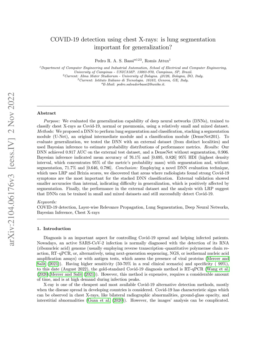 Purpose: we evaluated the generalization capability of deep neural networks (DNNs), trained to classify chest X-rays as Covid-19, normal or pneumonia, using a relatively small and mixed dataset. Methods: we proposed a DNN to perform lung segmentation and classification, stacking a segmentation module (U-Net), an original intermediate module and a classification module (DenseNet201). To evaluate generalization, we tested the DNN with an external dataset (from distinct localities) and used Bayesian inference to estimate probability distributions of performance metrics. Results: our DNN achieved 0.917 AUC on the external test dataset, and a DenseNet without segmentation, 0.906. Bayesian inference indicated mean accuracy of 76.1% and [0.695, 0.826] 95% HDI (highest density interval, which concentrates 95% of the metric's probability mass) with segmentation and, without segmentation, 71.7% and [0.646, 0.786]. Conclusion: employing a novel DNN evaluation technique, which uses LRP and Brixia scores, we discovered that areas where radiologists found strong Covid-19 symptoms are the most important for the stacked DNN classification. External validation showed smaller accuracies than internal, indicating difficulty in generalization, which is positively affected by segmentation. Finally, the performance in the external dataset and the analysis with LRP suggest that DNNs can be trained in small and mixed datasets and still successfully detect Covid-19.