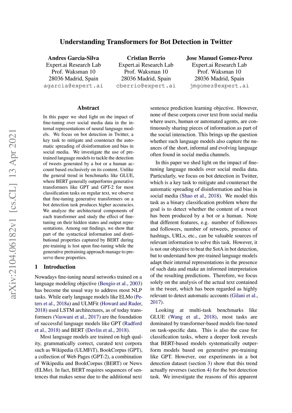 In this paper we shed light on the impact of fine-tuning over social media data in the internal representations of neural language models. We focus on bot detection in Twitter, a key task to mitigate and counteract the automatic spreading of disinformation and bias in social media. We investigate the use of pre-trained language models to tackle the detection of tweets generated by a bot or a human account based exclusively on its content. Unlike the general trend in benchmarks like GLUE, where BERT generally outperforms generative transformers like GPT and GPT-2 for most classification tasks on regular text, we observe that fine-tuning generative transformers on a bot detection task produces higher accuracies. We analyze the architectural components of each transformer and study the effect of fine-tuning on their hidden states and output representations. Among our findings, we show that part of the syntactical information and distributional properties captured by BERT during pre-training is lost upon fine-tuning while the generative pre-training approach manage to preserve these properties.