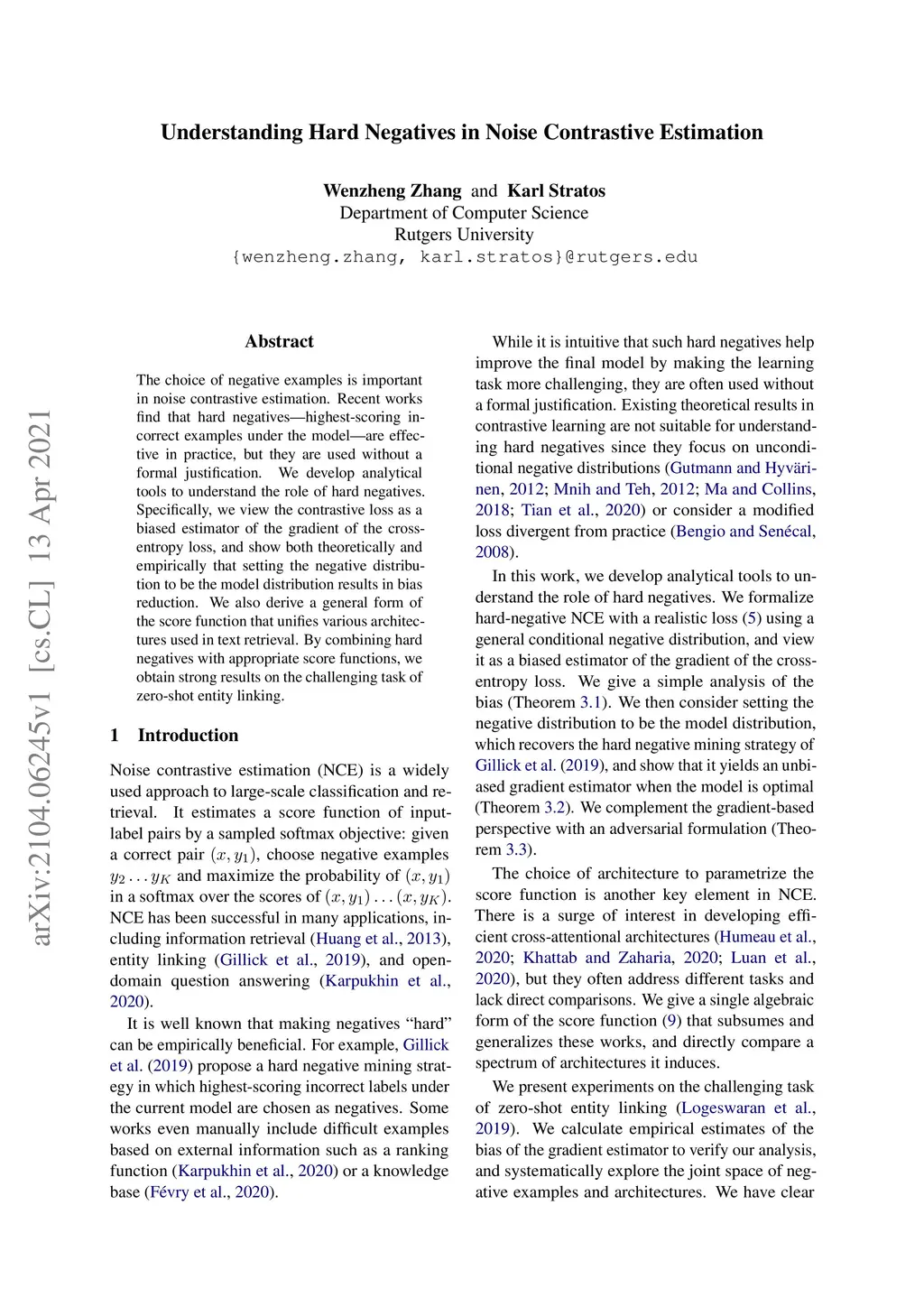The choice of negative examples is important in noise contrastive estimation. Recent works find that hard negatives -- highest-scoring incorrect examples under the model -- are effective in practice, but they are used without a formal justification. We develop analytical tools to understand the role of hard negatives. Specifically, we view the contrastive loss as a biased estimator of the gradient of the cross-entropy loss, and show both theoretically and empirically that setting the negative distribution to be the model distribution results in bias reduction. We also derive a general form of the score function that unifies various architectures used in text retrieval. By combining hard negatives with appropriate score functions, we obtain strong results on the challenging task of zero-shot entity linking.