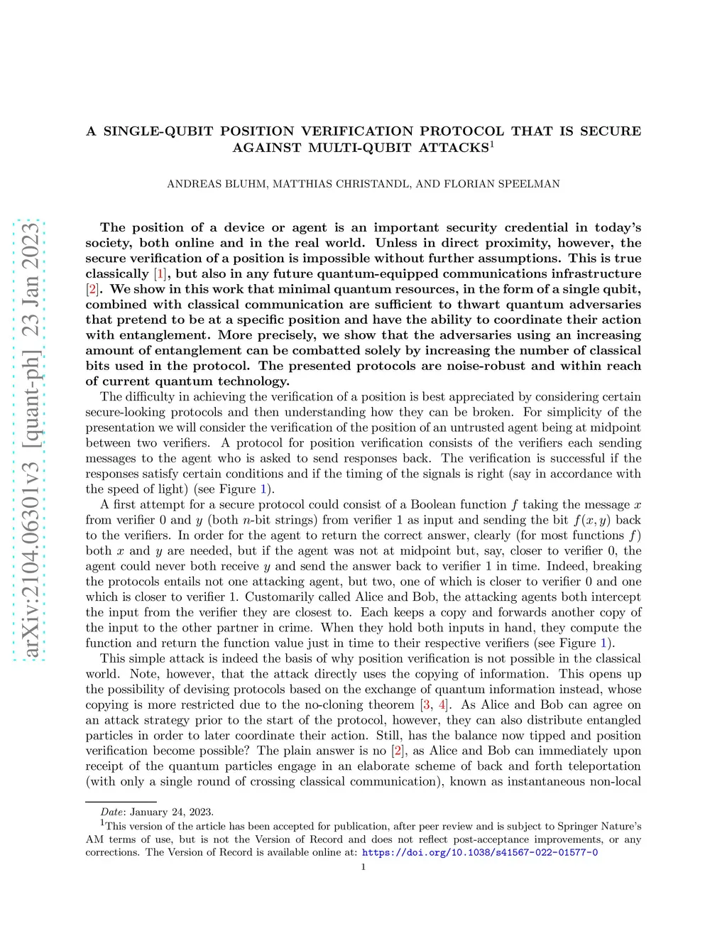 A single-qubit position verification protocol that is secure against