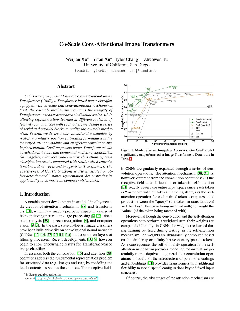 In this paper, we present Co-scale conv-attentional image Transformers (CoaT), a Transformer-based image classifier equipped with co-scale and conv-attentional mechanisms. First, the co-scale mechanism maintains the integrity of Transformers' encoder branches at individual scales, while allowing representations learned at different scales to effectively communicate with each other; we design a series of serial and parallel blocks to realize the co-scale mechanism. Second, we devise a conv-attentional mechanism by realizing a relative position embedding formulation in the factorized attention module with an efficient convolution-like implementation. CoaT empowers image Transformers with enriched multi-scale and contextual modeling capabilities. On ImageNet, relatively small CoaT models attain superior classification results compared with similar-sized convolutional neural networks and image/vision Transformers. The effectiveness of CoaT's backbone is also illustrated on object detection and instance segmentation, demonstrating its applicability to downstream computer vision tasks.