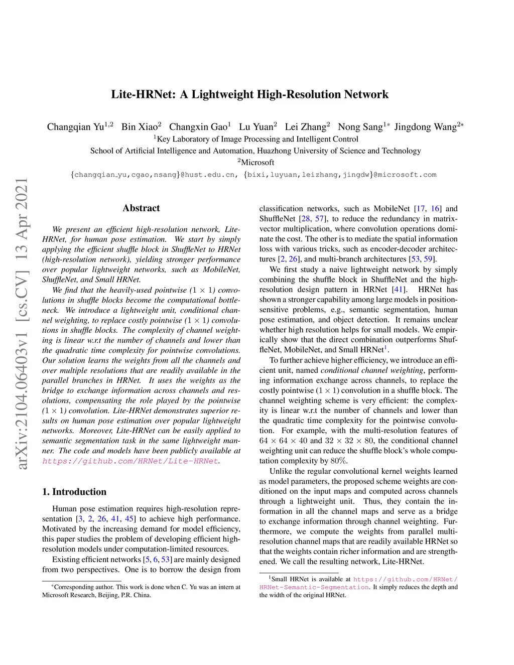 We present an efficient high-resolution network, Lite-HRNet, for human pose estimation. We start by simply applying the efficient shuffle block in ShuffleNet to HRNet (high-resolution network), yielding stronger performance over popular lightweight networks, such as MobileNet, ShuffleNet, and Small HRNet. We find that the heavily-used pointwise (1x1) convolutions in shuffle blocks become the computational bottleneck. We introduce a lightweight unit, conditional channel weighting, to replace costly pointwise (1x1) convolutions in shuffle blocks. The complexity of channel weighting is linear w.r.t the number of channels and lower than the quadratic time complexity for pointwise convolutions. Our solution learns the weights from all the channels and over multiple resolutions that are readily available in the parallel branches in HRNet. It uses the weights as the bridge to exchange information across channels and resolutions, compensating the role played by the pointwise (1x1) convolution. Lite-HRNet demonstrates superior results on human pose estimation over popular lightweight networks. Moreover, Lite-HRNet can be easily applied to semantic segmentation task in the same lightweight manner. The code and models have been publicly available at https://github.com/HRNet/Lite-HRNet.