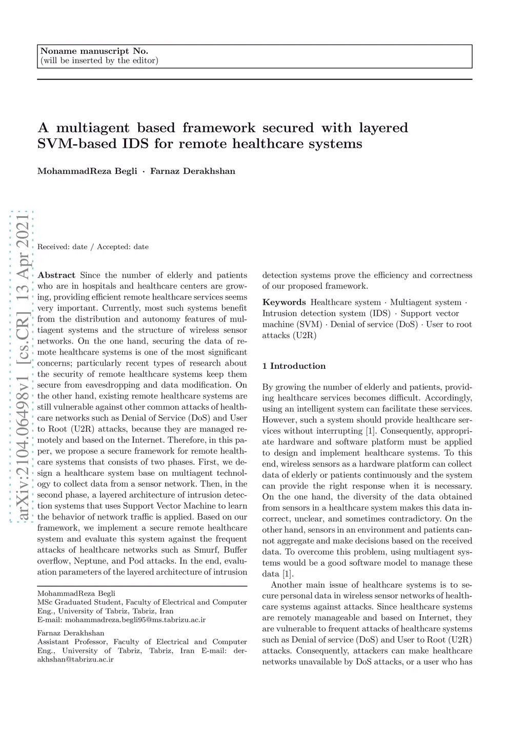 Since the number of elderly and patients who are in hospitals and healthcare centers are growing, providing efficient remote healthcare services seems very important. Currently, most such systems benefit from the distribution and autonomy features of multiagent systems and the structure of wireless sensor networks. On the one hand, securing the data of remote healthcare systems is one of the most significant concerns; particularly recent types of research about the security of remote healthcare systems keep them secure from eavesdropping and data modification. On the other hand, existing remote healthcare systems are still vulnerable against other common attacks of healthcare networks such as Denial of Service (DoS) and User to Root (U2R) attacks, because they are managed remotely and based on the Internet. Therefore, in this paper, we propose a secure framework for remote healthcare systems that consists of two phases. First, we design a healthcare system base on multiagent technology to collect data from a sensor network. Then, in the second phase, a layered architecture of intrusion detection systems that uses Support Vector Machine to learn the behavior of network traffic is applied. Based on our framework, we implement a secure remote healthcare system and evaluate this system against the frequent attacks of healthcare networks such as Smurf, Buffer overflow, Neptune, and Pod attacks. In the end, evaluation parameters of the layered architecture of intrusion detection systems prove the efficiency and correctness of our proposed framework.