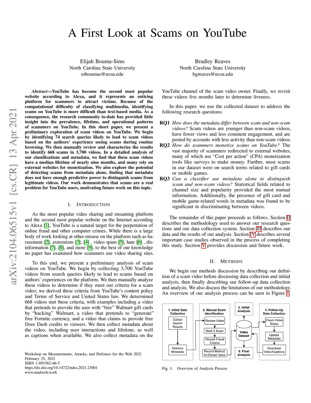 YouTube has become the second most popular website according to Alexa, and it represents an enticing platform for scammers to attract victims. Because of the computational difficulty of classifying multimedia, identifying scams on YouTube is more difficult than text-based media. As a consequence, the research community to-date has provided little insight into the prevalence, lifetime, and operational patterns of scammers on YouTube. In this short paper, we present a preliminary exploration of scam videos on YouTube. We begin by identifying 74 search queries likely to lead to scam videos based on the authors' experience seeing scams during routine browsing. We then manually review and characterize the results to identify 668 scams in 3,700 videos. In a detailed analysis of our classifications and metadata, we find that these scam videos have a median lifetime of nearly nine months, and many rely on external websites for monetization. We also explore the potential of detecting scams from metadata alone, finding that metadata does not have enough predictive power to distinguish scams from legitimate videos. Our work demonstrates that scams are a real problem for YouTube users, motivating future work on this topic.