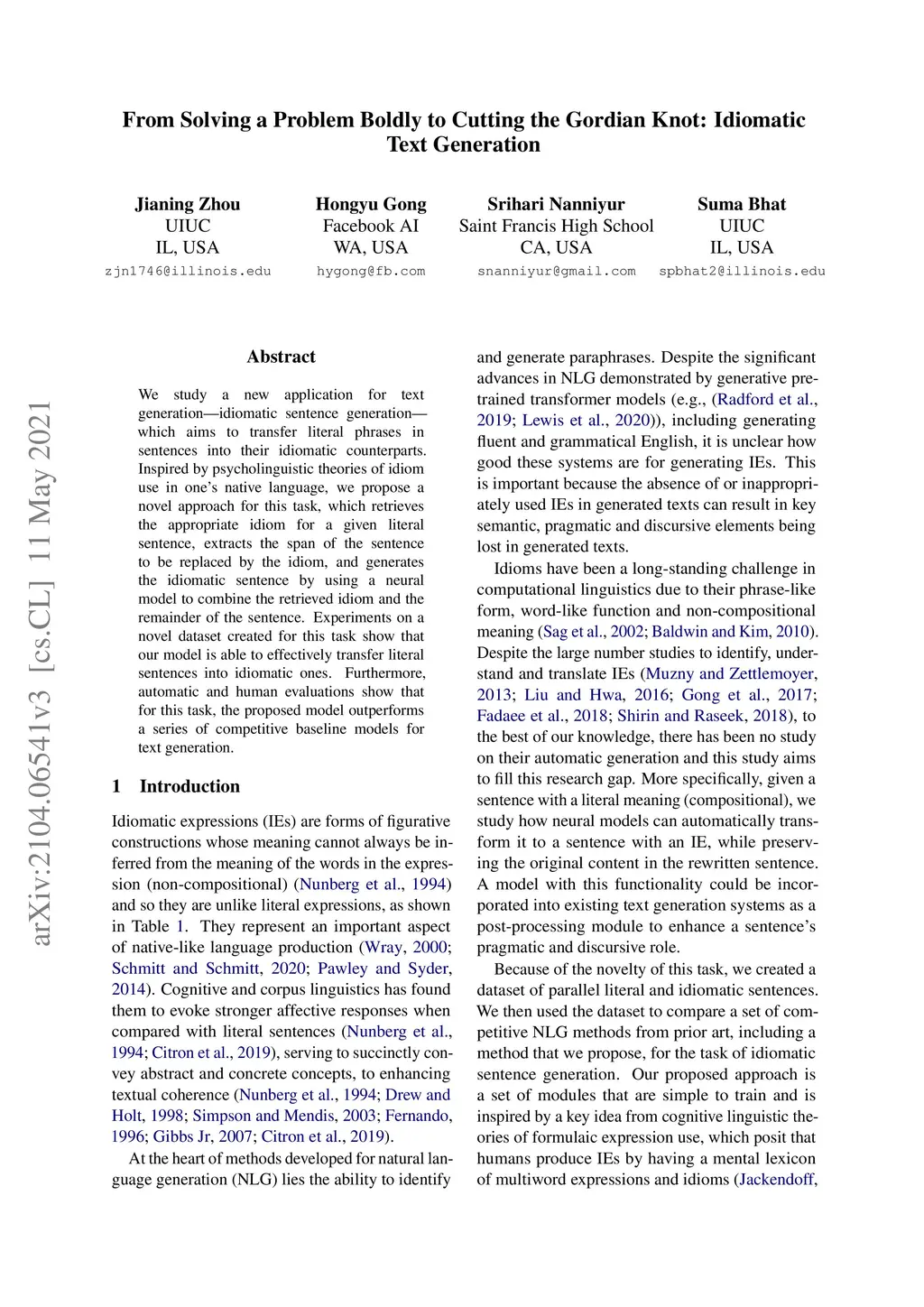 We study a new application for text generation -- idiomatic sentence generation -- which aims to transfer literal phrases in sentences into their idiomatic counterparts. Inspired by psycholinguistic theories of idiom use in one's native language, we propose a novel approach for this task, which retrieves the appropriate idiom for a given literal sentence, extracts the span of the sentence to be replaced by the idiom, and generates the idiomatic sentence by using a neural model to combine the retrieved idiom and the remainder of the sentence. Experiments on a novel dataset created for this task show that our model is able to effectively transfer literal sentences into idiomatic ones. Furthermore, automatic and human evaluations show that for this task, the proposed model outperforms a series of competitive baseline models for text generation.