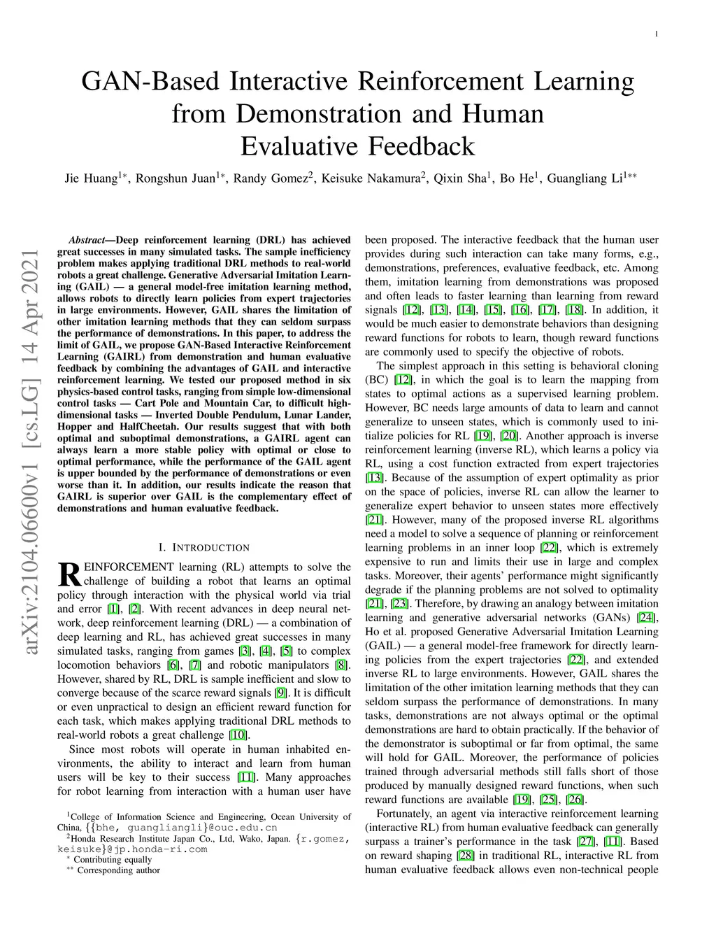 Deep reinforcement learning (DRL) has achieved great successes in many simulated tasks. The sample inefficiency problem makes applying traditional DRL methods to real-world robots a great challenge. Generative Adversarial Imitation Learning (GAIL) -- a general model-free imitation learning method, allows robots to directly learn policies from expert trajectories in large environments. However, GAIL shares the limitation of other imitation learning methods that they can seldom surpass the performance of demonstrations. In this paper, to address the limit of GAIL, we propose GAN-Based Interactive Reinforcement Learning (GAIRL) from demonstration and human evaluative feedback by combining the advantages of GAIL and interactive reinforcement learning. We tested our proposed method in six physics-based control tasks, ranging from simple low-dimensional control tasks -- Cart Pole and Mountain Car, to difficult high-dimensional tasks -- Inverted Double Pendulum, Lunar Lander, Hopper and HalfCheetah. Our results suggest that with both optimal and suboptimal demonstrations, a GAIRL agent can always learn a more stable policy with optimal or close to optimal performance, while the performance of the GAIL agent is upper bounded by the performance of demonstrations or even worse than it. In addition, our results indicate the reason that GAIRL is superior over GAIL is the complementary effect of demonstrations and human evaluative feedback.