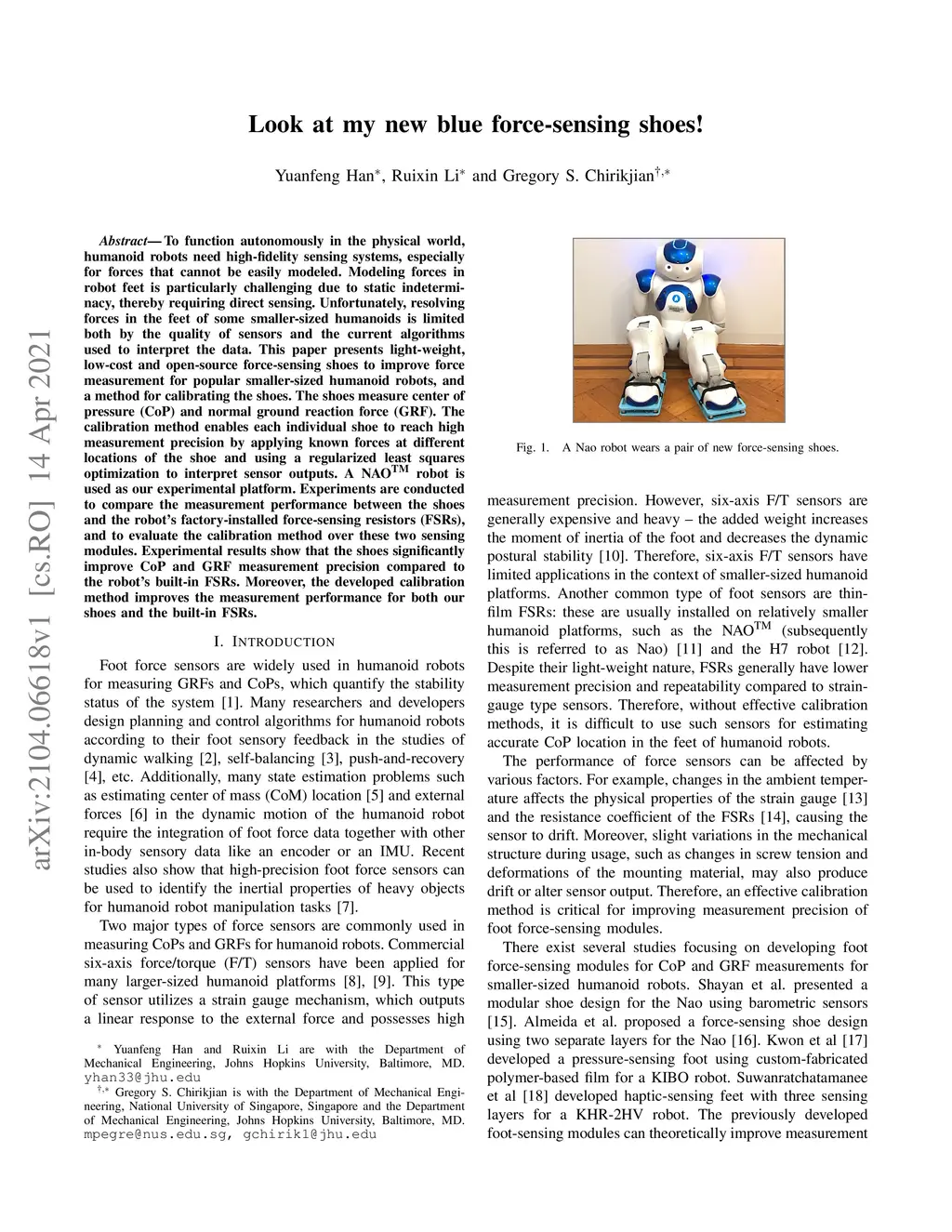 To function autonomously in the physical world, humanoid robots need high-fidelity sensing systems, especially for forces that cannot be easily modeled. Modeling forces in robot feet is particularly challenging due to static indeterminacy, thereby requiring direct sensing. Unfortunately, resolving forces in the feet of some smaller-sized humanoids is limited both by the quality of sensors and the current algorithms used to interpret the data. This paper presents light-weight, low-cost and open-source force-sensing shoes to improve force measurement for popular smaller-sized humanoid robots, and a method for calibrating the shoes. The shoes measure center of pressure (CoP) and normal ground reaction force (GRF). The calibration method enables each individual shoe to reach high measurement precision by applying known forces at different locations of the shoe and using a regularized least squares optimization to interpret sensor outputs. A NAO robot is used as our experimental platform. Experiments are conducted to compare the measurement performance between the shoes and the robot's factory-installed force-sensing resistors (FSRs), and to evaluate the calibration method over these two sensing modules. Experimental results show that the shoes significantly improve CoP and GRF measurement precision compared to the robot's built-in FSRs. Moreover, the developed calibration method improves the measurement performance for both our shoes and the built-in FSRs.