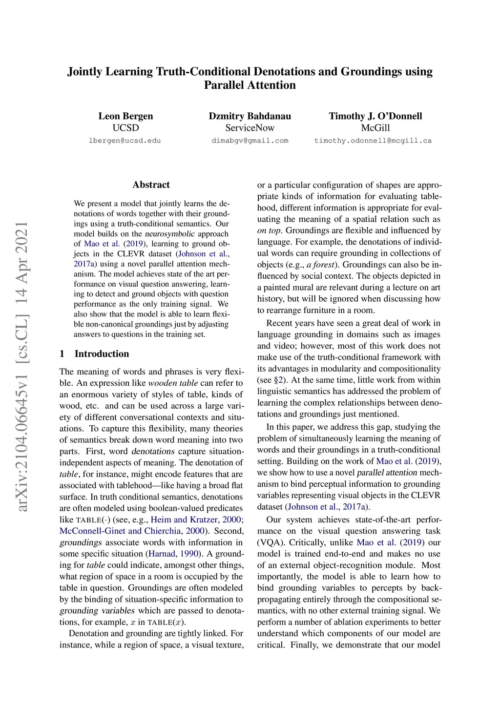 We present a model that jointly learns the denotations of words together with their groundings using a truth-conditional semantics. Our model builds on the neurosymbolic approach of Mao et al. (2019), learning to ground objects in the CLEVR dataset (Johnson et al., 2017) using a novel parallel attention mechanism. The model achieves state of the art performance on visual question answering, learning to detect and ground objects with question performance as the only training signal. We also show that the model is able to learn flexible non-canonical groundings just by adjusting answers to questions in the training set.