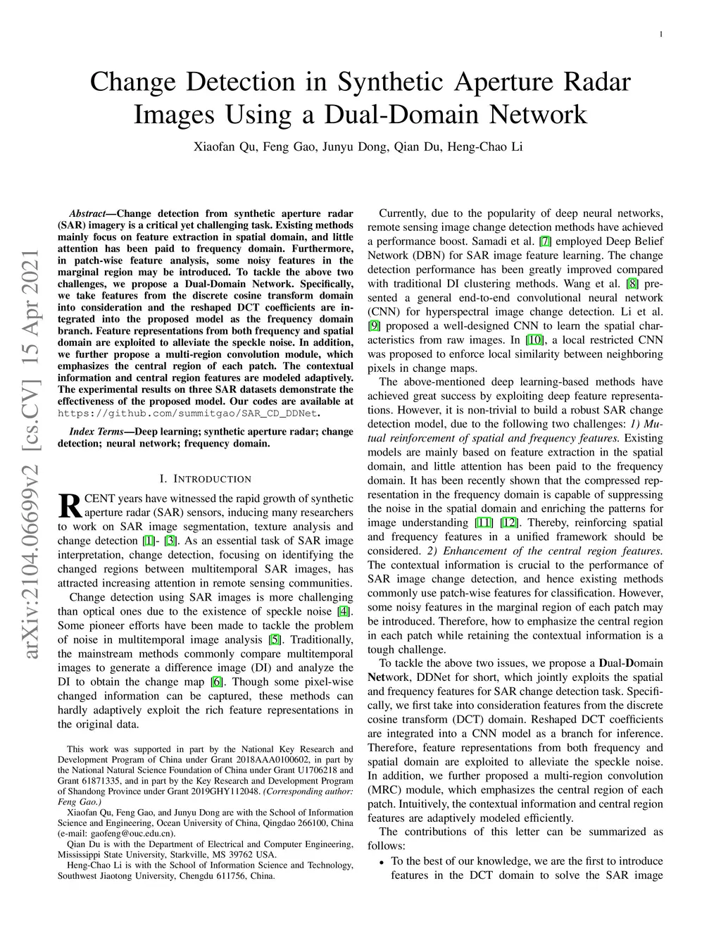 Change Detection in Synthetic Aperture Radar Images Using a Dual-Domain