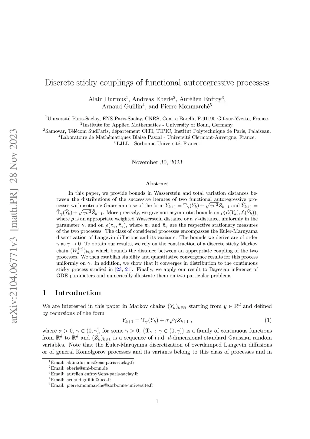In this paper, we provide bounds in Wasserstein and total variation distances between the distributions of the successive iterates of two functional autoregressive processes with isotropic Gaussian noise of the form and . More precisely, we give non-asymptotic bounds on , where is an appropriate weighted Wasserstein distance or a -distance, uniformly in the parameter , and on , where and are the respective stationary measures of the two processes. The class of considered processes encompasses the Euler-Maruyama discretization of Langevin diffusions and its variants. The bounds we derive are of order as . To obtain our results, we rely on the construction of a discrete sticky Markov chain which bounds the distance between an appropriate coupling of the two processes. We then establish stability and quantitative convergence results for this process uniformly on . In addition, we show that it converges in distribution to the continuous sticky process studied in previous work. Finally, we apply our result to Bayesian inference of ODE parameters and numerically illustrate them on two particular problems.