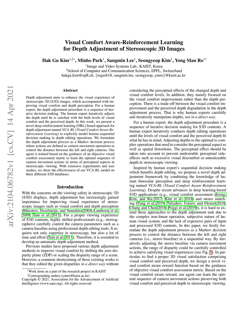 Visual Comfort Aware-Reinforcement Learning for Depth Adjustment of
