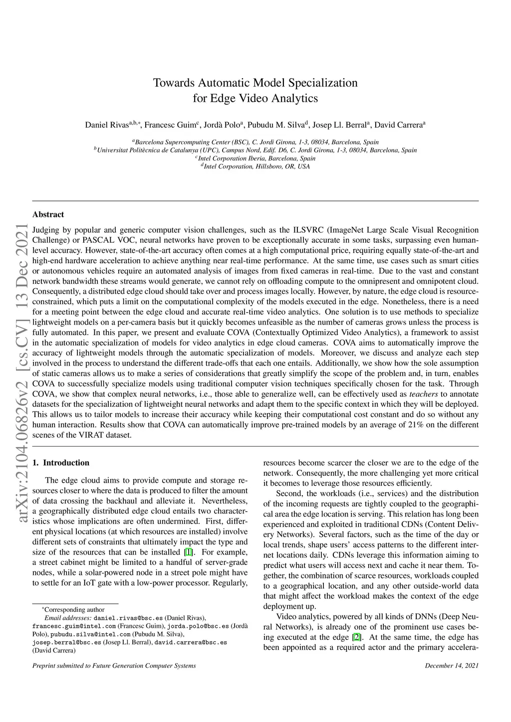 Judging by popular and generic computer vision challenges, such as the ImageNet or PASCAL VOC, neural networks have proven to be exceptionally accurate in recognition tasks. However, state-of-the-art accuracy often comes at a high computational price, requiring hardware acceleration to achieve real-time performance, while use cases, such as smart cities, require images from fixed cameras to be analyzed in real-time. Due to the amount of network bandwidth these streams would generate, we cannot rely on offloading compute to a centralized cloud. Thus, a distributed edge cloud is expected to process images locally. However, the edge is, by nature, resource-constrained, which puts a limit on the computational complexity that can execute. Yet, there is a need for a meeting point between the edge and accurate real-time video analytics. Specializing lightweight models on a per-camera basis may help but it quickly becomes unfeasible as the number of cameras grows unless the process is automated. In this paper, we present and evaluate COVA (Contextually Optimized Video Analytics), a framework to assist in the automatic specialization of models for video analytics in edge cameras. COVA automatically improves the accuracy of lightweight models through their specialization. Moreover, we discuss and review each step involved in the process to understand the different trade-offs that each one entails. Additionally, we show how the sole assumption of static cameras allows us to make a series of considerations that greatly simplify the scope of the problem. Finally, experiments show that state-of-the-art models, i.e., able to generalize to unseen environments, can be effectively used as teachers to tailor smaller networks to a specific context, boosting accuracy at a constant computational cost. Results show that our COVA can automatically improve accuracy of pre-trained models by an average of 21%.