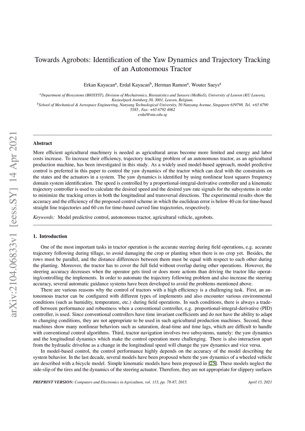 Towards agrobots: Identification of the yaw dynamics and trajectory