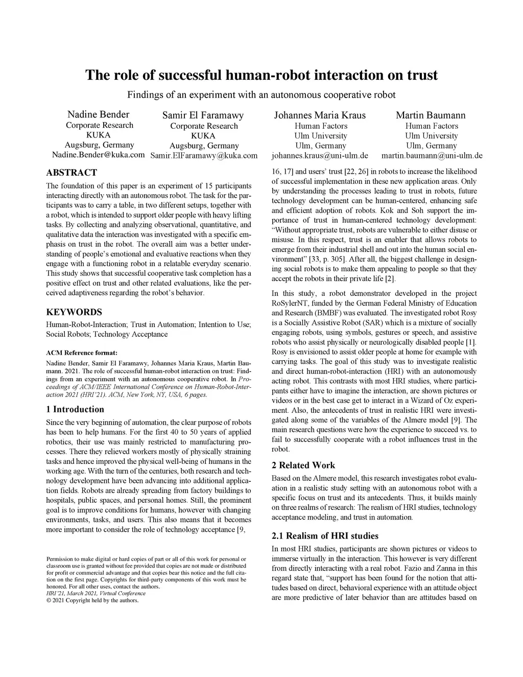 The foundation of this paper is an experiment of fifteen participants interacting directly with an autonomous robot. The task for the participants was to carry a table, in two different setups, together with a robot, which is intended to support older people with heavy lifting tasks. By collecting and analyzing observational, quantitative, and qualitative data the interaction was investigated with a specific emphasis on trust in the robot. The overall aim was a better understanding of people's emotional and evaluative reactions when they engage with a functioning robot in a relatable everyday scenario. This study shows that successful cooperative task completion has a positive effect on trust and other related evaluations, like the perceived adaptiveness regarding the robot's behavior.