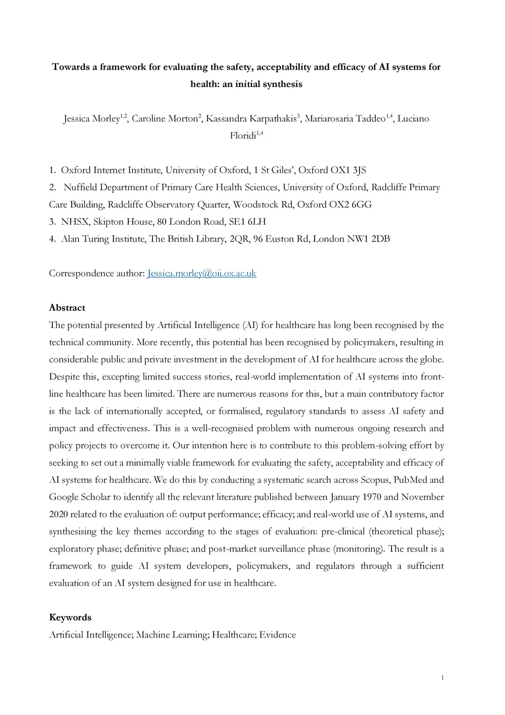 The potential presented by Artificial Intelligence (AI) for healthcare has long been recognised by the technical community. More recently, this potential has been recognised by policymakers, resulting in considerable public and private investment in the development of AI for healthcare across the globe. Despite this, excepting limited success stories, real-world implementation of AI systems into front-line healthcare has been limited. There are numerous reasons for this, but a main contributory factor is the lack of internationally accepted, or formalised, regulatory standards to assess AI safety and impact and effectiveness. This is a well-recognised problem with numerous ongoing research and policy projects to overcome it. Our intention here is to contribute to this problem-solving effort by seeking to set out a minimally viable framework for evaluating the safety, acceptability and efficacy of AI systems for healthcare. We do this by conducting a systematic search across Scopus, PubMed and Google Scholar to identify all the relevant literature published between January 1970 and November 2020 related to the evaluation of: output performance; efficacy; and real-world use of AI systems, and synthesising the key themes according to the stages of evaluation: pre-clinical (theoretical phase); exploratory phase; definitive phase; and post-market surveillance phase (monitoring). The result is a framework to guide AI system developers, policymakers, and regulators through a sufficient evaluation of an AI system designed for use in healthcare.