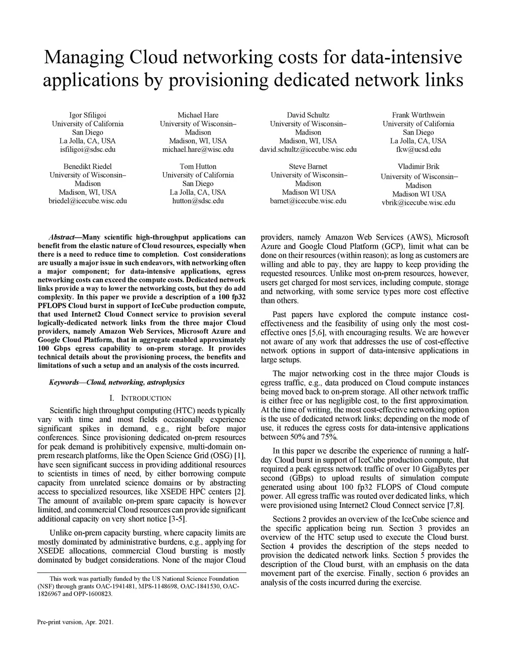 Many scientific high-throughput applications can benefit from the elastic nature of Cloud resources, especially when there is a need to reduce time to completion. Cost considerations are usually a major issue in such endeavors, with networking often a major component; for data-intensive applications, egress networking costs can exceed the compute costs. Dedicated network links provide a way to lower the networking costs, but they do add complexity. In this paper we provide a description of a 100 fp32 PFLOPS Cloud burst in support of IceCube production compute, that used Internet2 Cloud Connect service to provision several logically-dedicated network links from the three major Cloud providers, namely Amazon Web Services, Microsoft Azure and Google Cloud Platform, that in aggregate enabled approximately 100 Gbps egress capability to on-prem storage. It provides technical details about the provisioning process, the benefits and limitations of such a setup and an analysis of the costs incurred.