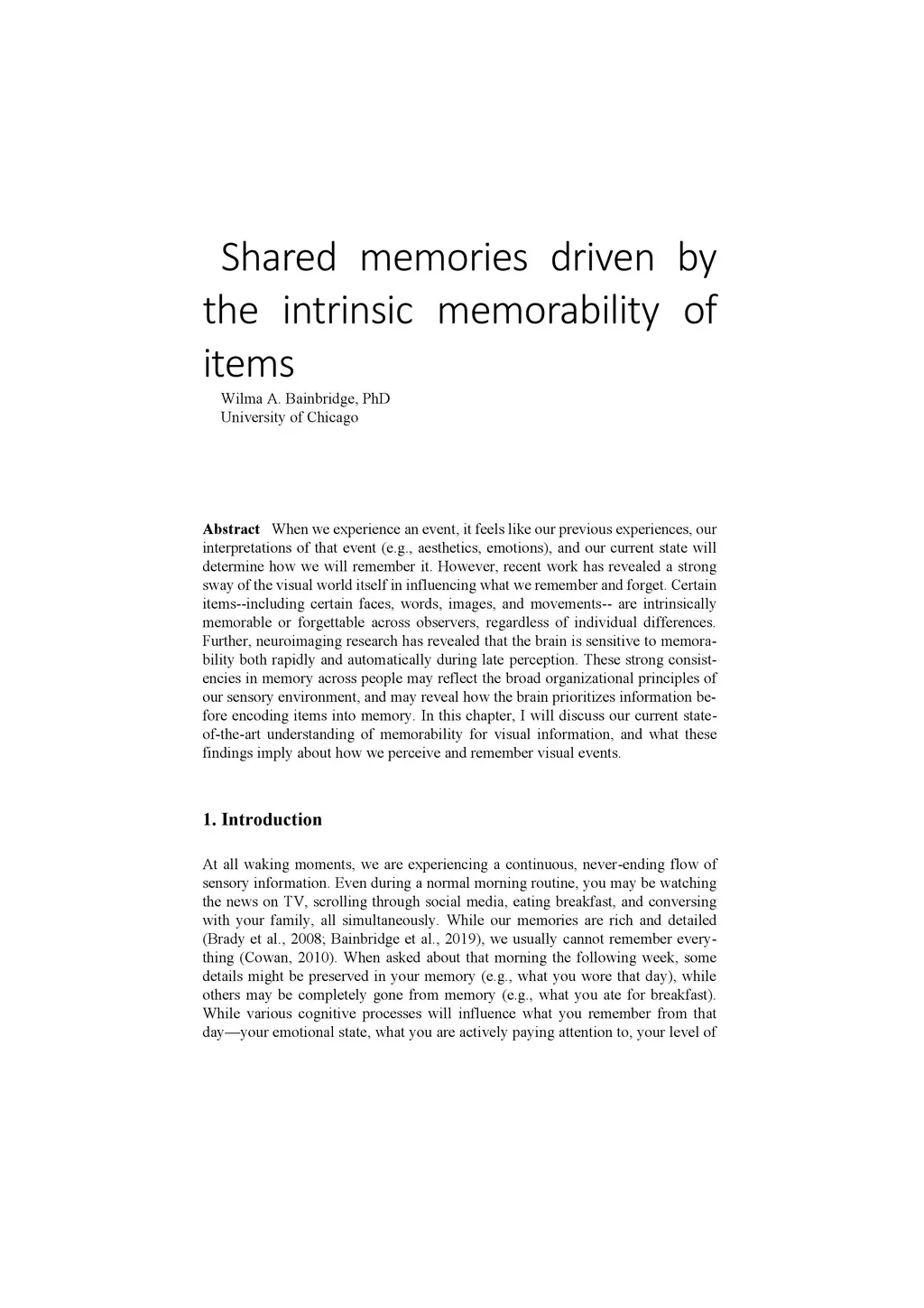 When we experience an event, it feels like our previous experiences, our interpretations of that event (e.g., aesthetics, emotions), and our current state will determine how we will remember it. However, recent work has revealed a strong sway of the visual world itself in influencing what we remember and forget. Certain items -- including certain faces, words, images, and movements -- are intrinsically memorable or forgettable across observers, regardless of individual differences. Further, neuroimaging research has revealed that the brain is sensitive to memorability both rapidly and automatically during late perception. These strong consistencies in memory across people may reflect the broad organizational principles of our sensory environment, and may reveal how the brain prioritizes information before encoding items into memory. In this chapter, I will discuss our current state-of-the-art understanding of memorability for visual information, and what these findings imply about how we perceive and remember visual events.