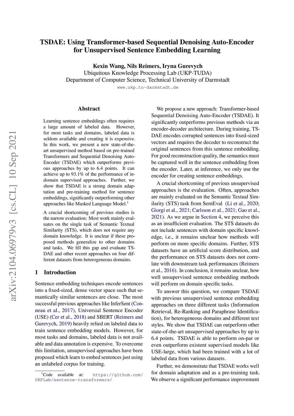 TSDAE: Using Transformer-based Sequential Denoising Auto-Encoder for