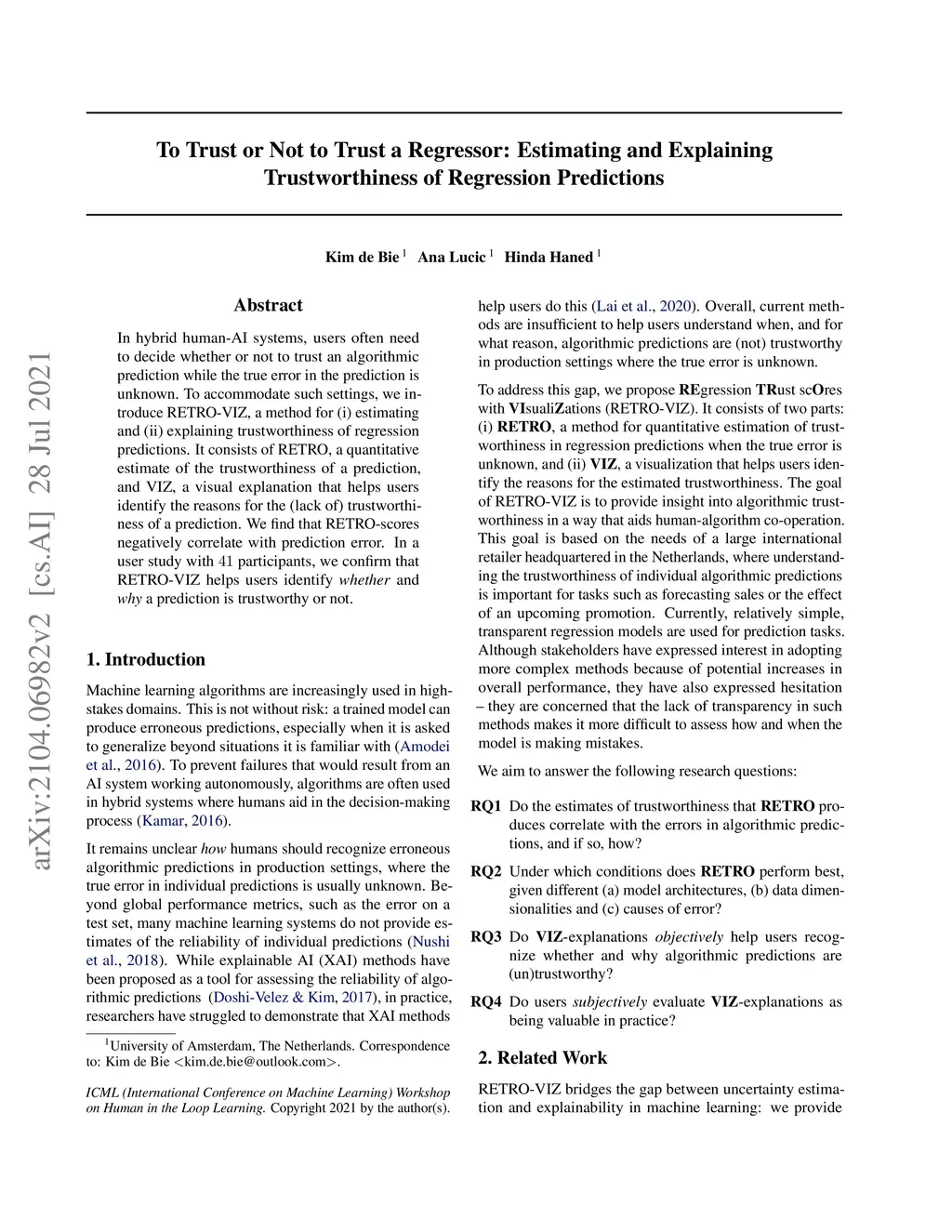 In hybrid human-AI systems, users need to decide whether or not to trust an algorithmic prediction while the true error in the prediction is unknown. To accommodate such settings, we introduce RETRO-VIZ, a method for (i) estimating and (ii) explaining trustworthiness of regression predictions. It consists of RETRO, a quantitative estimate of the trustworthiness of a prediction, and VIZ, a visual explanation that helps users identify the reasons for the (lack of) trustworthiness of a prediction. We find that RETRO-scores negatively correlate with prediction error across 117 experimental settings, indicating that RETRO provides a useful measure to distinguish trustworthy predictions from untrustworthy ones. In a user study with 41 participants, we find that VIZ-explanations help users identify whether a prediction is trustworthy or not: on average, 95.1% of participants correctly select the more trustworthy prediction, given a pair of predictions. In addition, an average of 75.6% of participants can accurately describe why a prediction seems to be (not) trustworthy. Finally, we find that the vast majority of users subjectively experience RETRO-VIZ as a useful tool to assess the trustworthiness of algorithmic predictions.