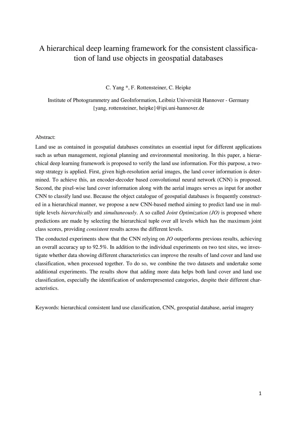 Land use as contained in geospatial databases constitutes an essential input for different applica-tions such as urban management, regional planning and environmental monitoring. In this paper, a hierarchical deep learning framework is proposed to verify the land use information. For this purpose, a two-step strategy is applied. First, given high-resolution aerial images, the land cover information is determined. To achieve this, an encoder-decoder based convolutional neural net-work (CNN) is proposed. Second, the pixel-wise land cover information along with the aerial images serves as input for another CNN to classify land use. Because the object catalogue of geospatial databases is frequently constructed in a hierarchical manner, we propose a new CNN-based method aiming to predict land use in multiple levels hierarchically and simultaneously. A so called Joint Optimization (JO) is proposed where predictions are made by selecting the hier-archical tuple over all levels which has the maximum joint class scores, providing consistent results across the different levels. The conducted experiments show that the CNN relying on JO outperforms previous results, achieving an overall accuracy up to 92.5%. In addition to the individual experiments on two test sites, we investigate whether data showing different characteristics can improve the results of land cover and land use classification, when processed together. To do so, we combine the two datasets and undertake some additional experiments. The results show that adding more data helps both land cover and land use classification, especially the identification of underrepre-sented categories, despite their different characteristics.