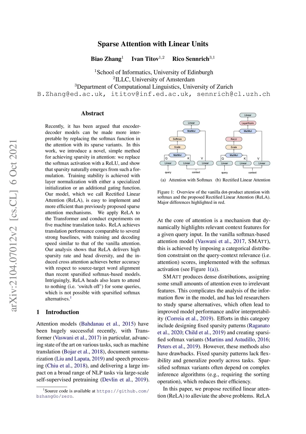 Sparse Attention with Linear Units