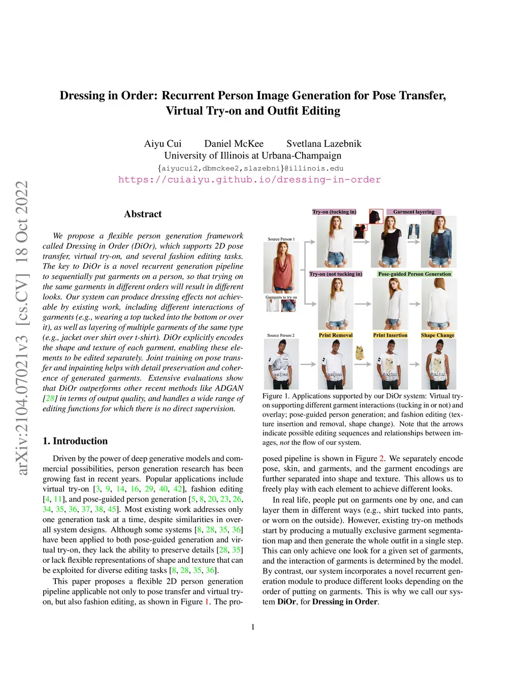 We propose a flexible person generation framework called Dressing in Order (DiOr), which supports 2D pose transfer, virtual try-on, and several fashion editing tasks. The key to DiOr is a novel recurrent generation pipeline to sequentially put garments on a person, so that trying on the same garments in different orders will result in different looks. Our system can produce dressing effects not achievable by existing work, including different interactions of garments (e.g., wearing a top tucked into the bottom or over it), as well as layering of multiple garments of the same type (e.g., jacket over shirt over t-shirt). DiOr explicitly encodes the shape and texture of each garment, enabling these elements to be edited separately. Joint training on pose transfer and inpainting helps with detail preservation and coherence of generated garments. Extensive evaluations show that DiOr outperforms other recent methods like ADGAN in terms of output quality, and handles a wide range of editing functions for which there is no direct supervision.