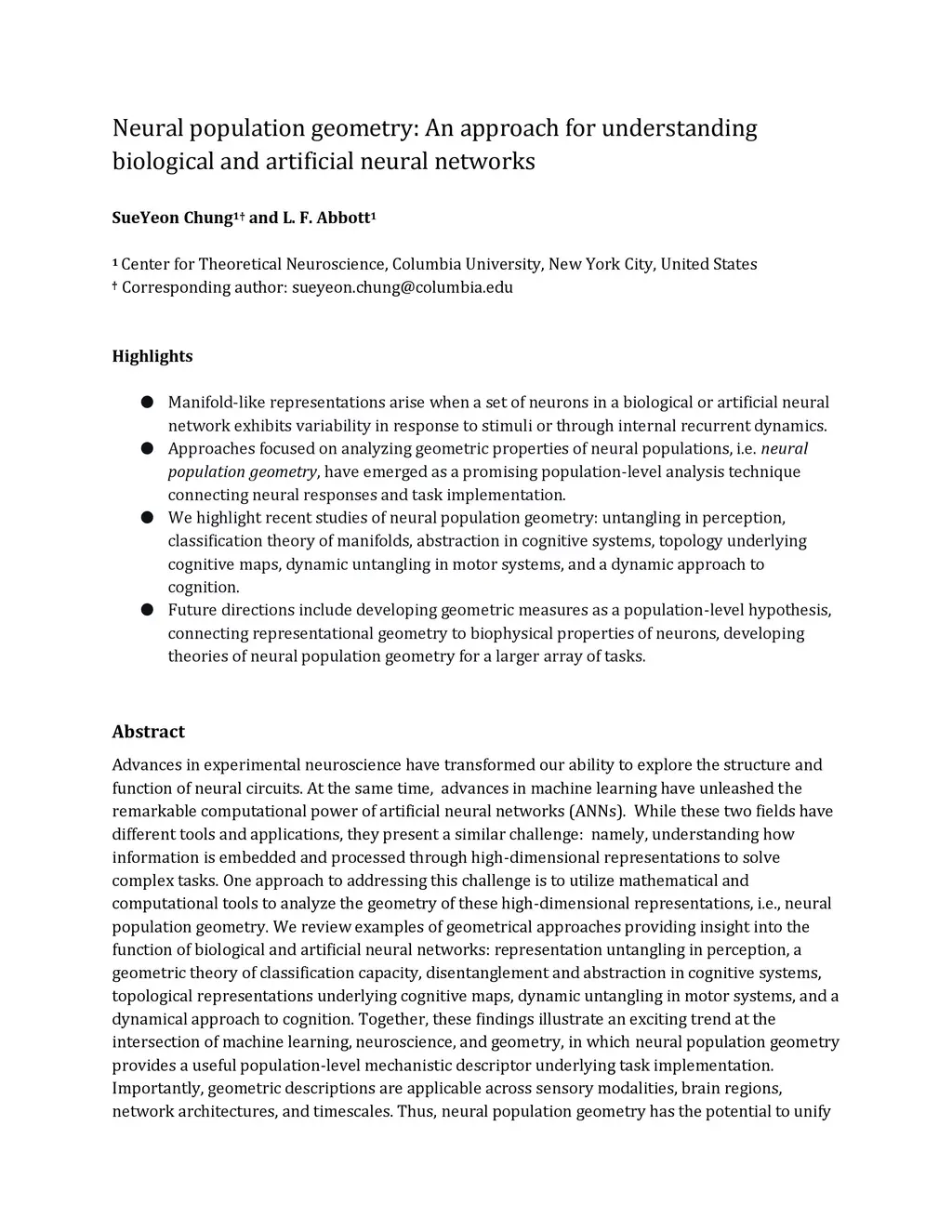 Advances in experimental neuroscience have transformed our ability to explore the structure and function of neural circuits. At the same time, advances in machine learning have unleashed the remarkable computational power of artificial neural networks (ANNs). While these two fields have different tools and applications, they present a similar challenge: namely, understanding how information is embedded and processed through high-dimensional representations to solve complex tasks. One approach to addressing this challenge is to utilize mathematical and computational tools to analyze the geometry of these high-dimensional representations, i.e., neural population geometry. We review examples of geometrical approaches providing insight into the function of biological and artificial neural networks: representation untangling in perception, a geometric theory of classification capacity, disentanglement and abstraction in cognitive systems, topological representations underlying cognitive maps, dynamic untangling in motor systems, and a dynamical approach to cognition. Together, these findings illustrate an exciting trend at the intersection of machine learning, neuroscience, and geometry, in which neural population geometry provides a useful population-level mechanistic descriptor underlying task implementation. Importantly, geometric descriptions are applicable across sensory modalities, brain regions, network architectures and timescales. Thus, neural population geometry has the potential to unify our understanding of structure and function in biological and artificial neural networks, bridging the gap between single neurons, populations and behavior.