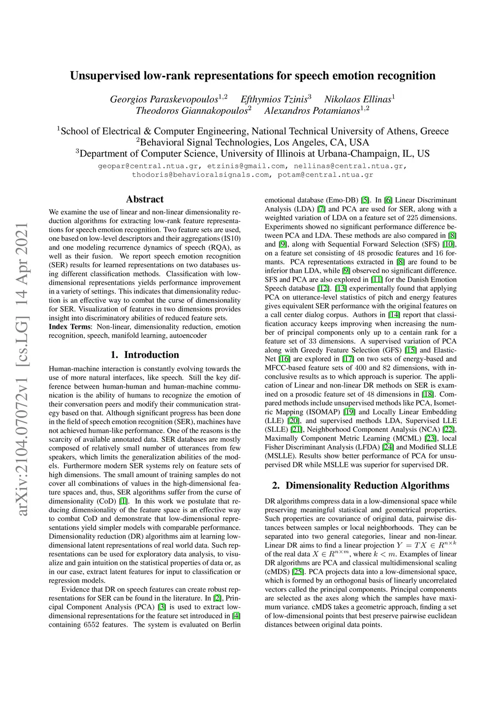 We examine the use of linear and non-linear dimensionality reduction algorithms for extracting low-rank feature representations for speech emotion recognition. Two feature sets are used, one based on low-level descriptors and their aggregations (IS10) and one modeling recurrence dynamics of speech (RQA), as well as their fusion. We report speech emotion recognition (SER) results for learned representations on two databases using different classification methods. Classification with low-dimensional representations yields performance improvement in a variety of settings. This indicates that dimensionality reduction is an effective way to combat the curse of dimensionality for SER. Visualization of features in two dimensions provides insight into discriminatory abilities of reduced feature sets.