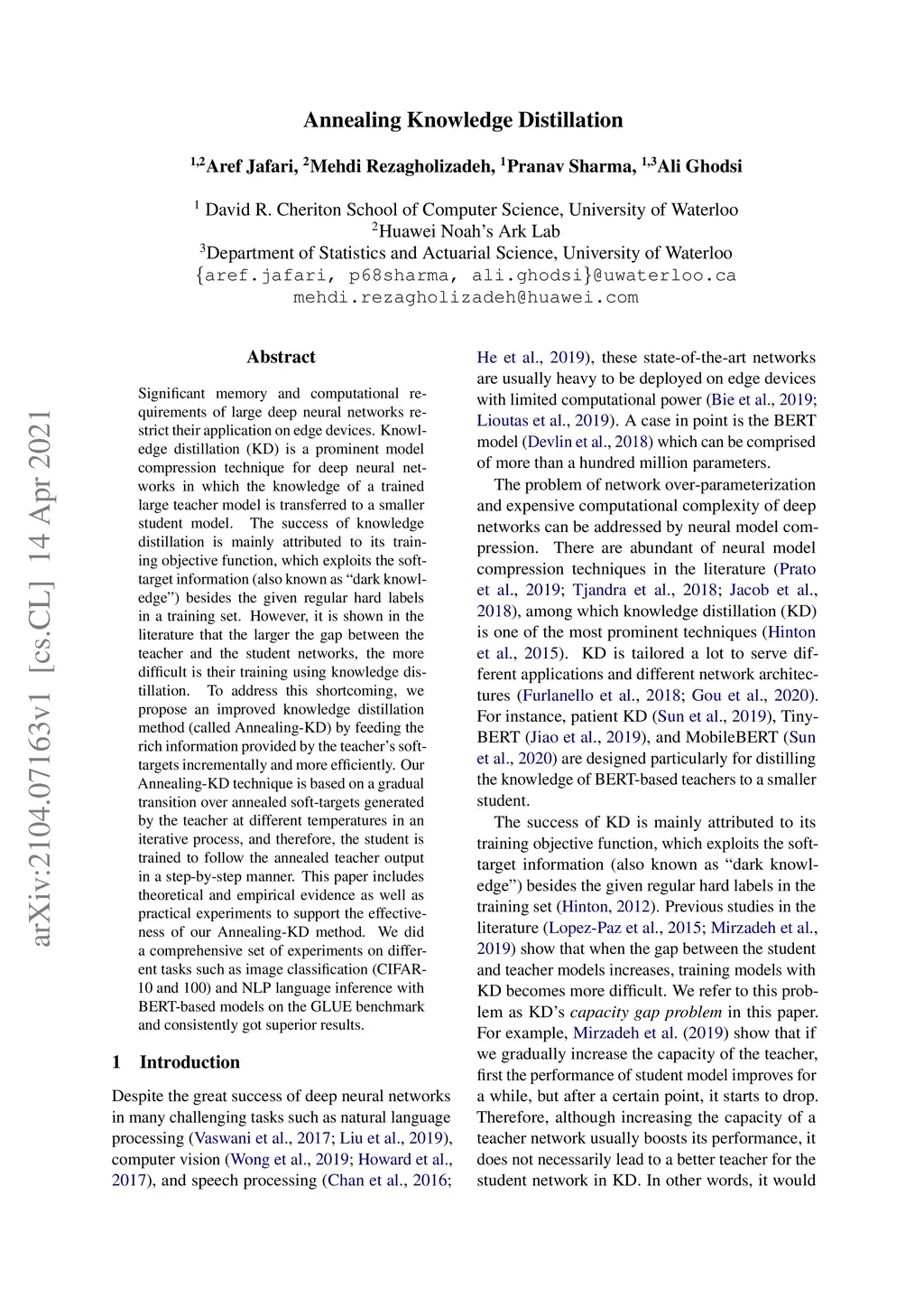 Significant memory and computational requirements of large deep neural networks restrict their application on edge devices. Knowledge distillation (KD) is a prominent model compression technique for deep neural networks in which the knowledge of a trained large teacher model is transferred to a smaller student model. The success of knowledge distillation is mainly attributed to its training objective function, which exploits the soft-target information (also known as "dark knowledge") besides the given regular hard labels in a training set. However, it is shown in the literature that the larger the gap between the teacher and the student networks, the more difficult is their training using knowledge distillation. To address this shortcoming, we propose an improved knowledge distillation method (called Annealing-KD) by feeding the rich information provided by the teacher's soft-targets incrementally and more efficiently. Our Annealing-KD technique is based on a gradual transition over annealed soft-targets generated by the teacher at different temperatures in an iterative process, and therefore, the student is trained to follow the annealed teacher output in a step-by-step manner. This paper includes theoretical and empirical evidence as well as practical experiments to support the effectiveness of our Annealing-KD method. We did a comprehensive set of experiments on different tasks such as image classification (CIFAR-10 and 100) and NLP language inference with BERT-based models on the GLUE benchmark and consistently got superior results.
