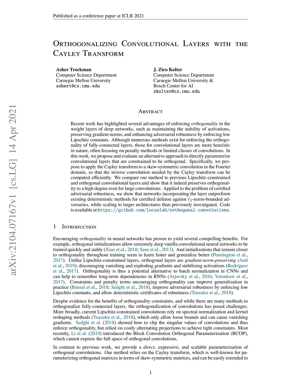 Orthogonalizing Convolutional Layers with the Cayley Transform