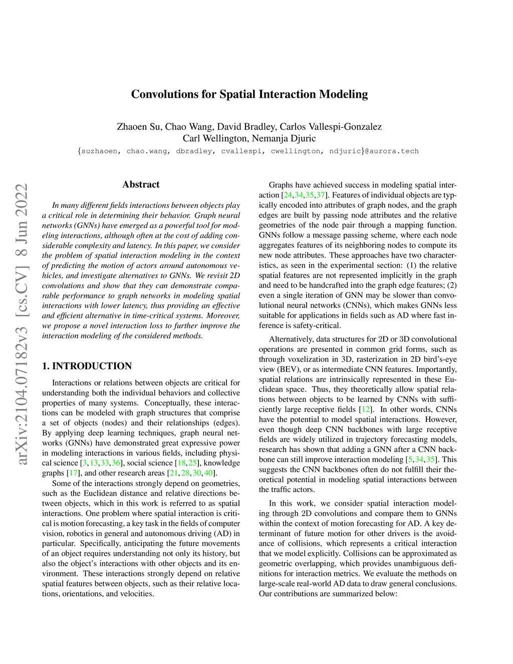 In many different fields interactions between objects play a critical role in determining their behavior. Graph neural networks (GNNs) have emerged as a powerful tool for modeling interactions, although often at the cost of adding considerable complexity and latency. In this paper, we consider the problem of spatial interaction modeling in the context of predicting the motion of actors around autonomous vehicles, and investigate alternatives to GNNs. We revisit 2D convolutions and show that they can demonstrate comparable performance to graph networks in modeling spatial interactions with lower latency, thus providing an effective and efficient alternative in time-critical systems. Moreover, we propose a novel interaction loss to further improve the interaction modeling of the considered methods.