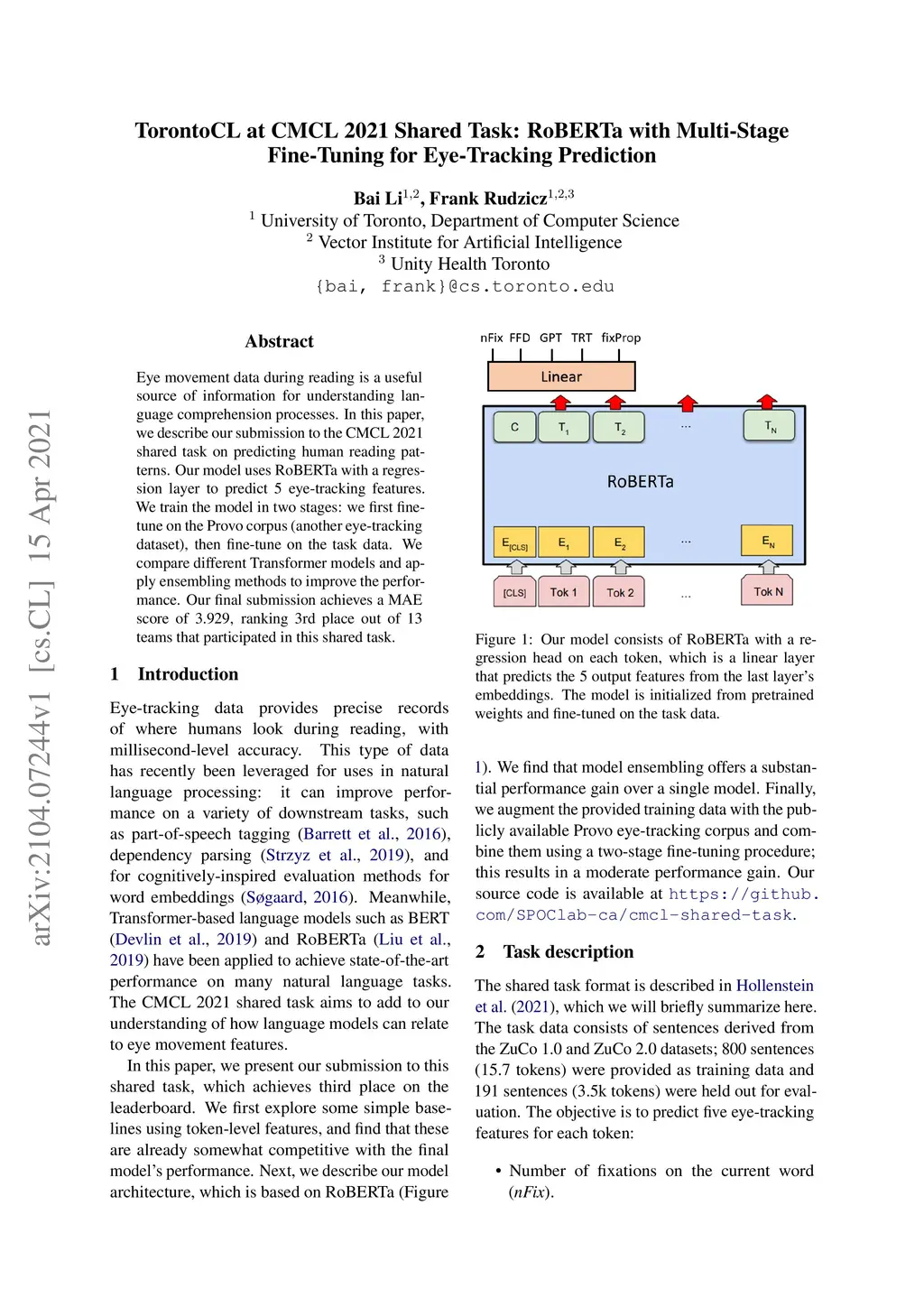 TorontoCL at CMCL 2021 Shared Task: RoBERTa with Multi-Stage Fine-Tuning