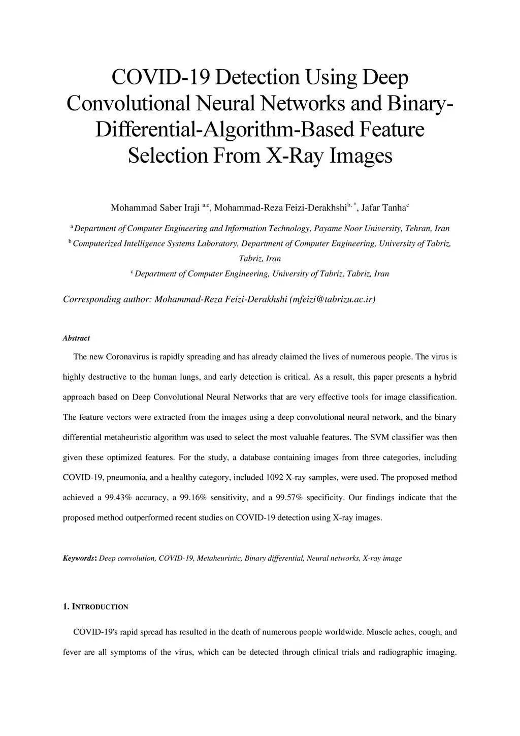 The new Coronavirus is spreading rapidly, and it has taken the lives of many people so far. The virus has destructive effects on the human lung, and early detection is very important. Deep Convolution neural networks are such powerful tools in classifying images. Therefore, in this paper, a hybrid approach based on a deep network is presented. Feature vectors were extracted by applying a deep convolution neural network on the images, and useful features were selected by the binary differential meta-heuristic algorithm. These optimized features were given to the SVM classifier. A database consisting of three categories of images such as COVID-19, pneumonia, and healthy included in 1092 X-ray samples was considered. The proposed method achieved an accuracy of 99.43%, a sensitivity of 99.16%, and a specificity of 99.57%. Our results demonstrate that the suggested approach is better than recent studies on COVID-19 detection with X-ray images.